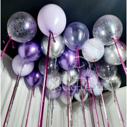Состав: - 4 шара фиолетовый хром 35 см; - 4 шара серебряный хром 35 см; - 4 шара с конфетти 35 см..