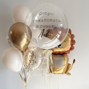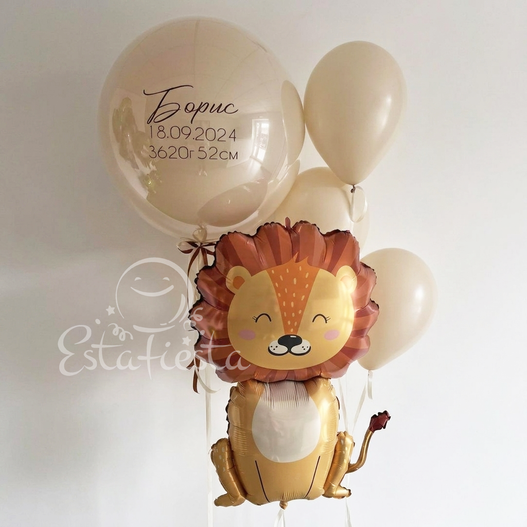 Бежевая композиция из шаров со львенком на выписку мальчика