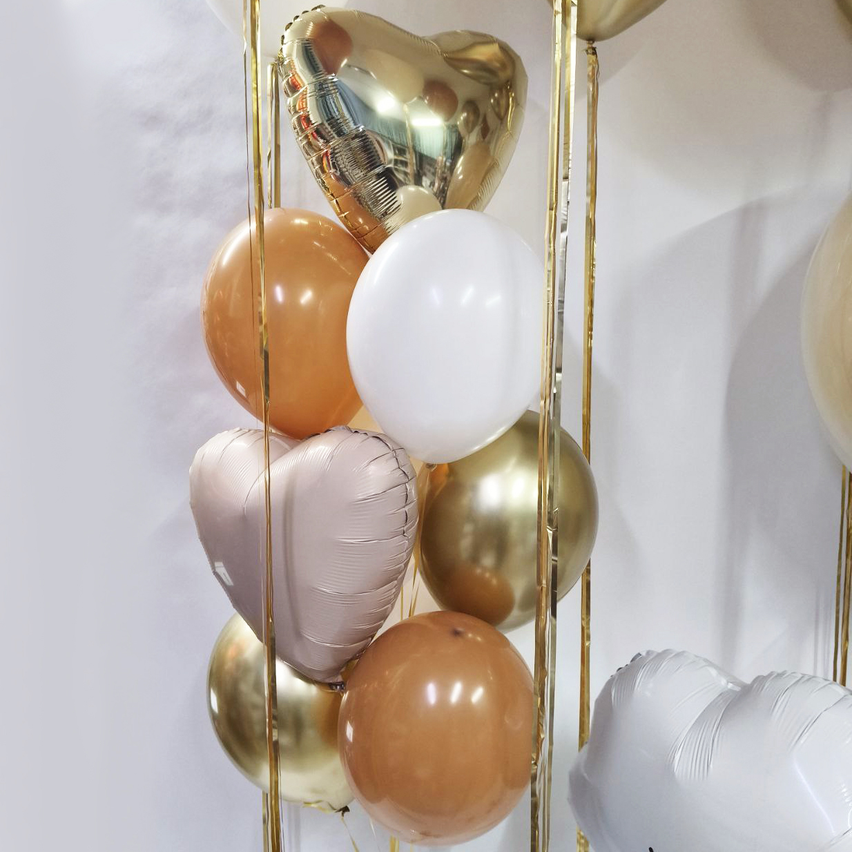 - фонтан из 2 фольгированных сердец, 2 шаров золотой хром, 2 бежевых, 2 коричневых шаров , 2 белых