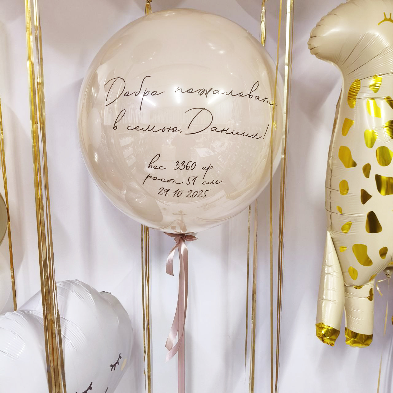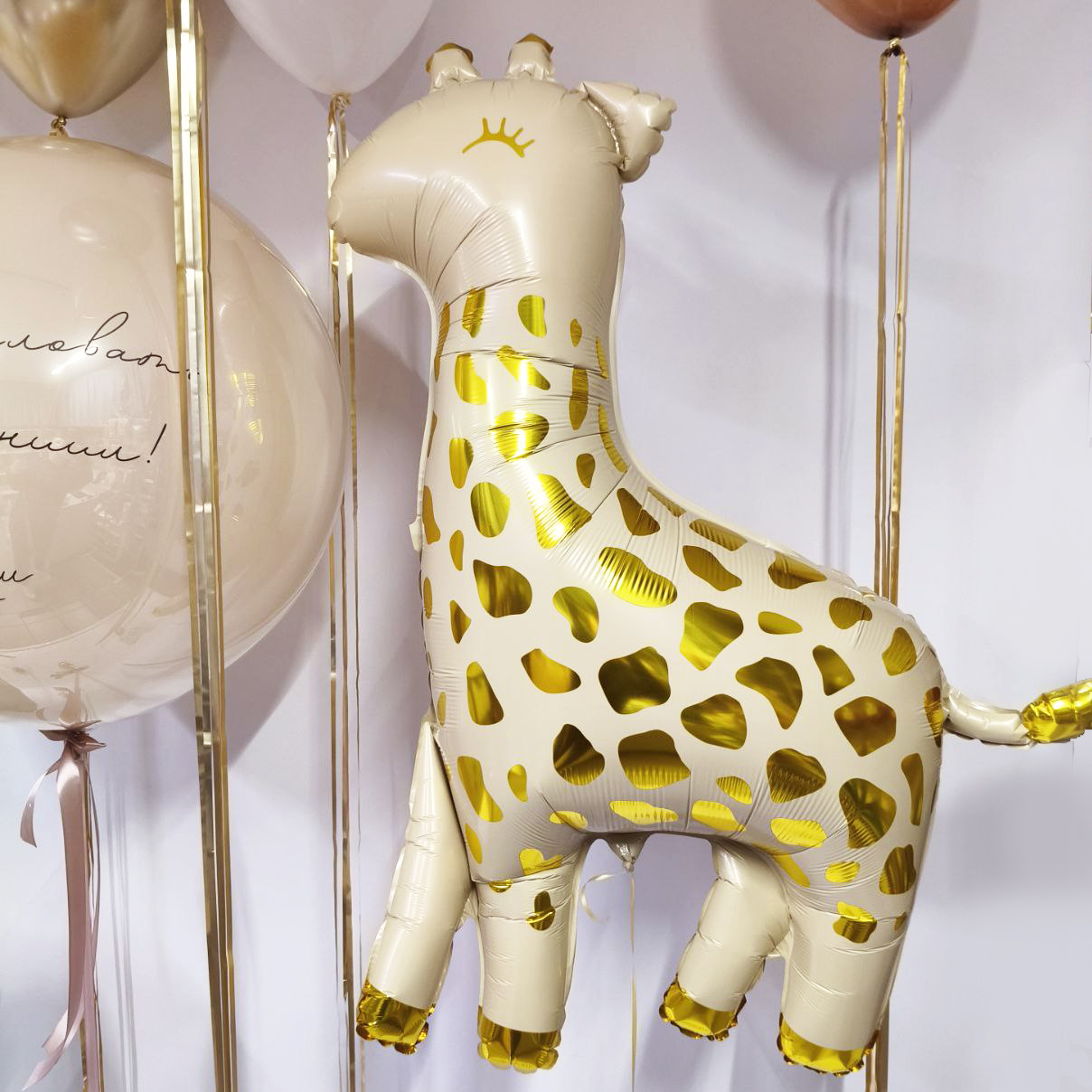 Состав:- жираф;- стеклянный бежевый шар 60см с метрикой;- 2 связки по 8 шаров, цвета - бежевый и зол..