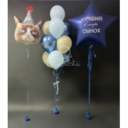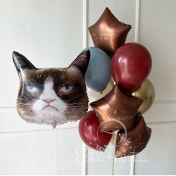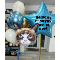 Большая фольгированная звезда с индивидуальной надписью, фольгированная фигура головы сердитого кота и фонтан из шаров