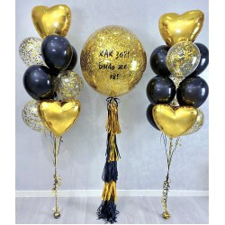 Состав:- большой "стеклянный" кремовый шар с индивидуальной надписью;- фонтан из 4 черных, 3 золотых..