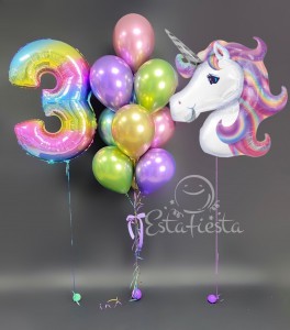 Цифра 3 радужная, фонтан из хромовых шаров и сиреневый единорог