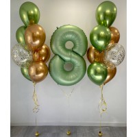 Два фонтана из гелиевых шаров в салатово-золотом цвете и салатовая фольгированная цифра 8