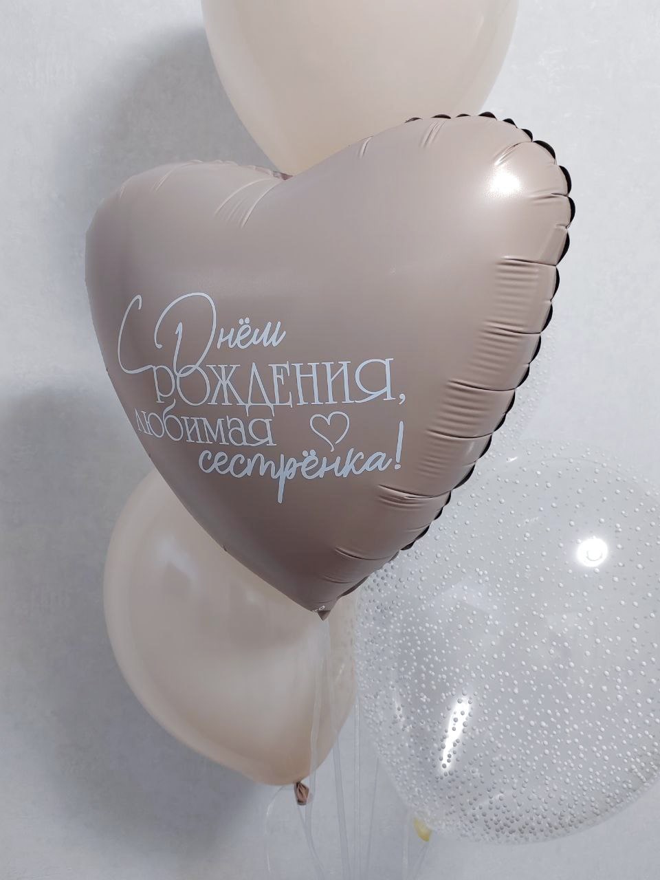 Состав:- 1 сердце с надписью "С днём рождения, любимая сестренка" (если хотите, надпись можно поменять);- 2 шара с белым конфетти;- 2 шара с белыми пенопластовыми шариками...