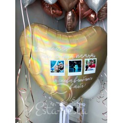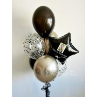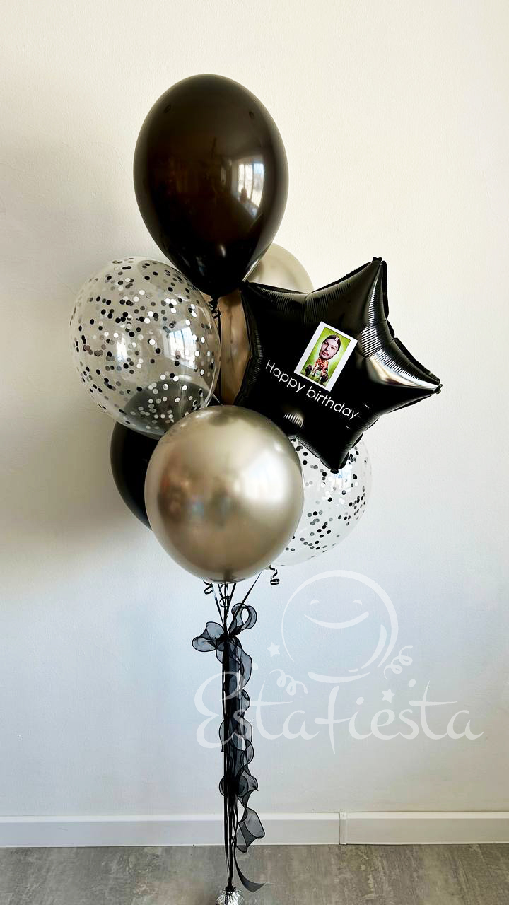 Состав:- 1 звезда с фото (фотографию можете прислать при подтверждении заказа менеджером);- 2 шара с конфетти;- 2 шара золотой хром;- 2 черных шара...