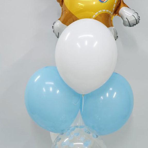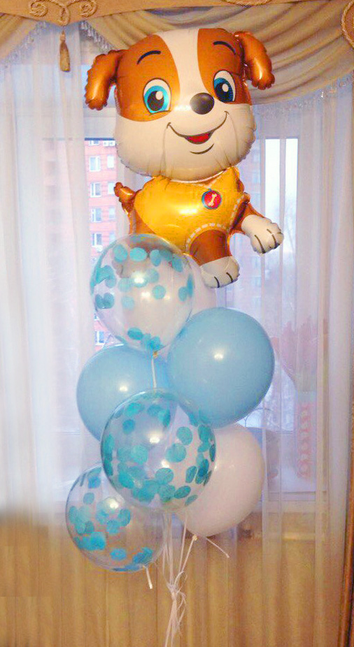 Состав:- фигурный шар собачка;- 3 шара с голубым конфетти;- 2 белых шара;- 2 голубых шара...