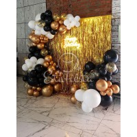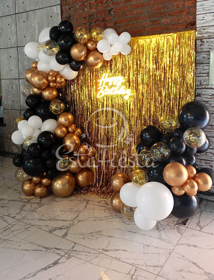 Фотозона с дождиком шарами и неоновой надписью черно-золотая