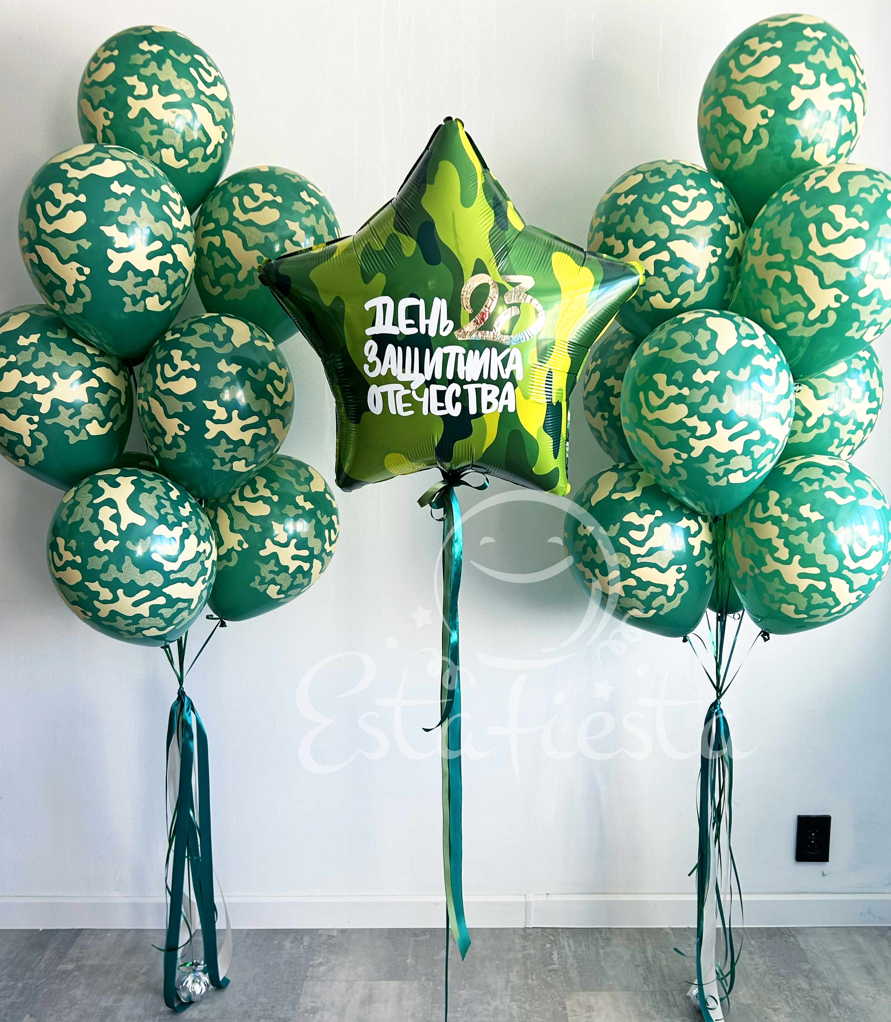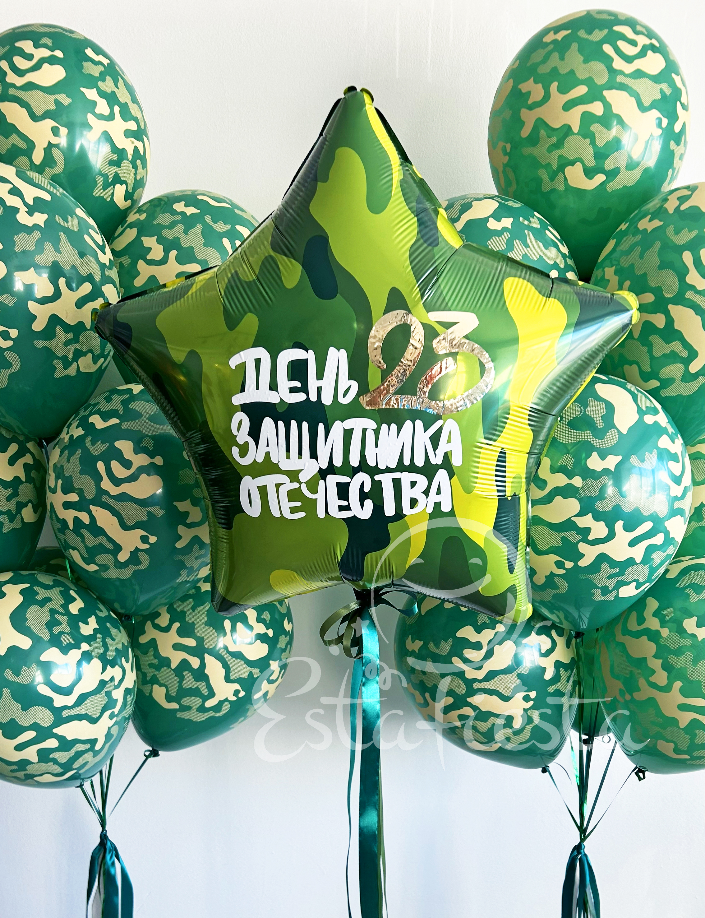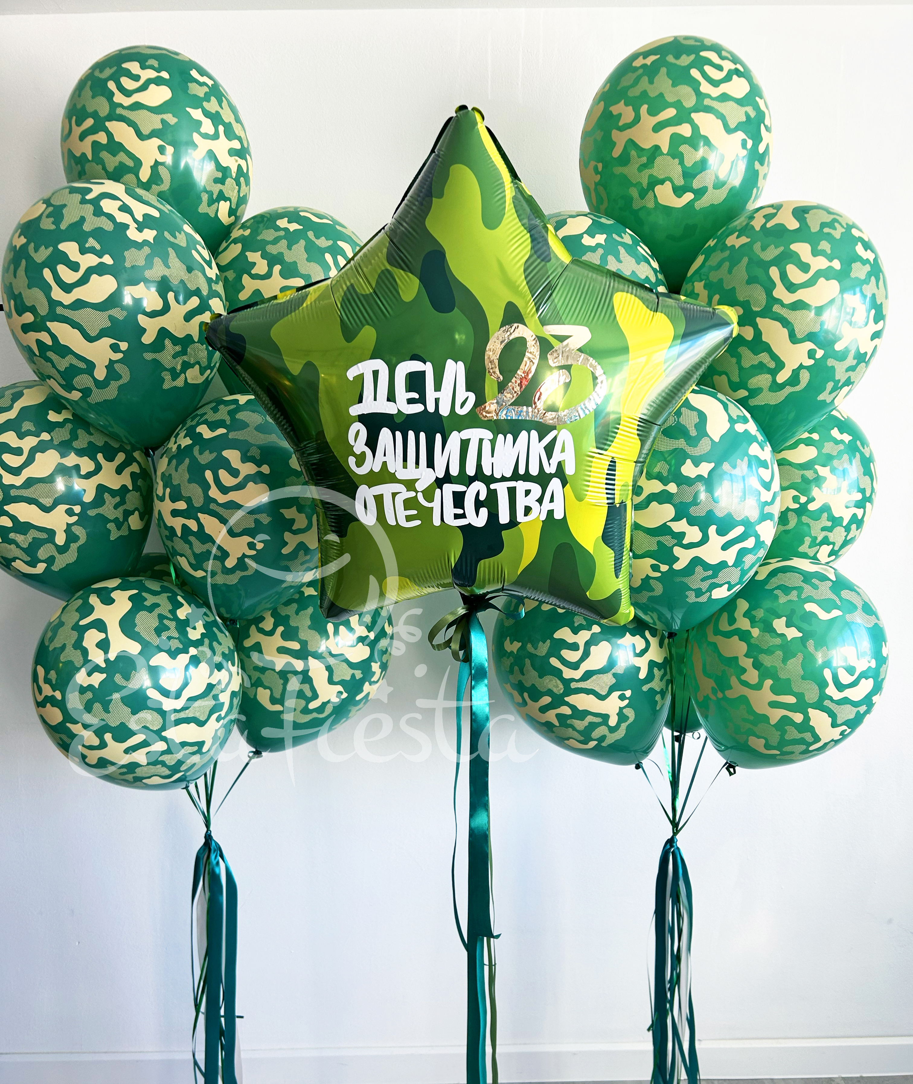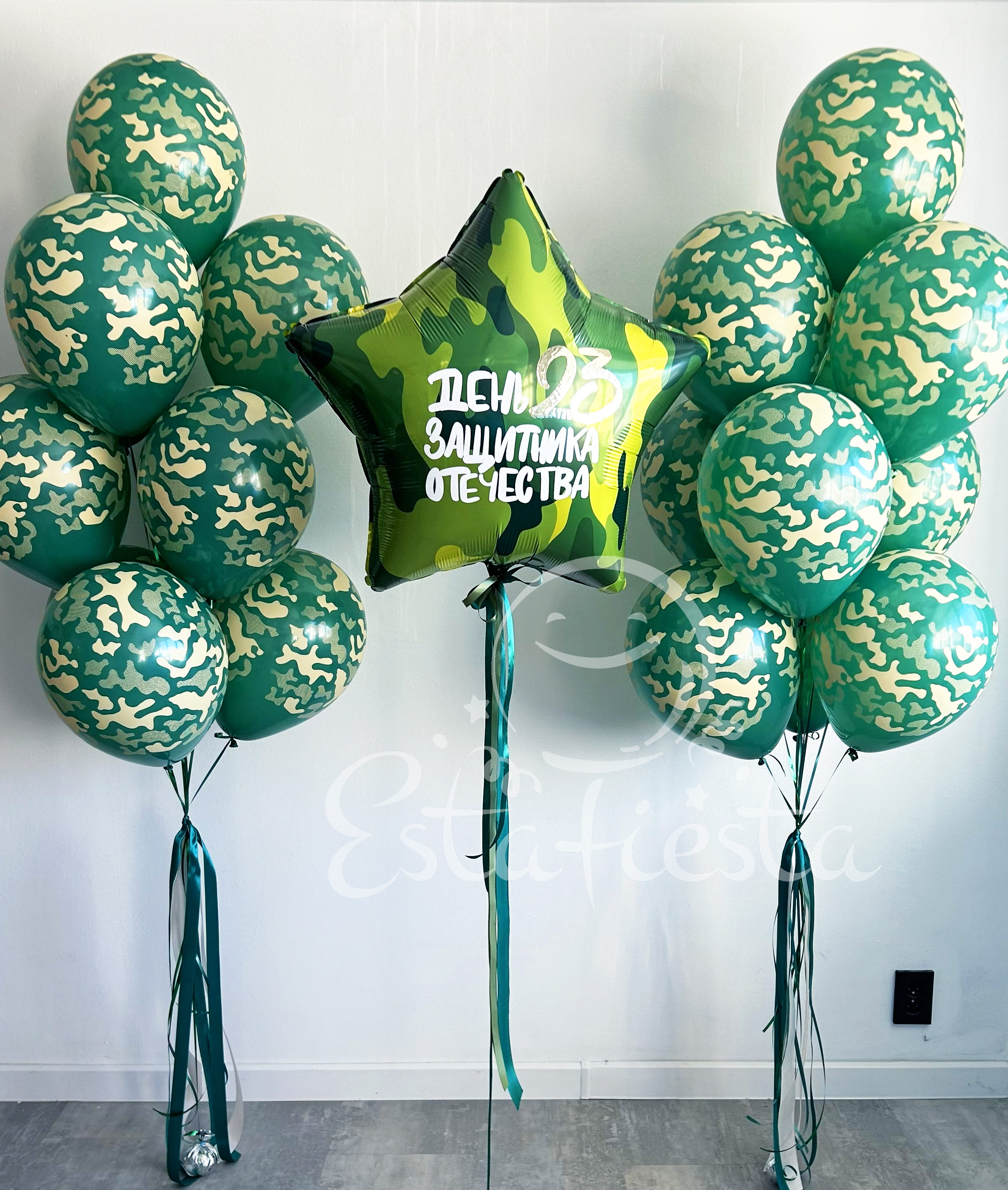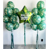 Состав:- большая камуфляжная звезда с надписью "День защитника Отечества";- 2 фонтана по 10 шаров камуфляжной расцветки...