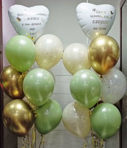 2 фонтана по 1 сердцу с надписями (при желании надписи можно корректировать), 2 кремовых шара с блестками, 1 белому шару с блестками, 3 оливковых и 3 золотых шаров.