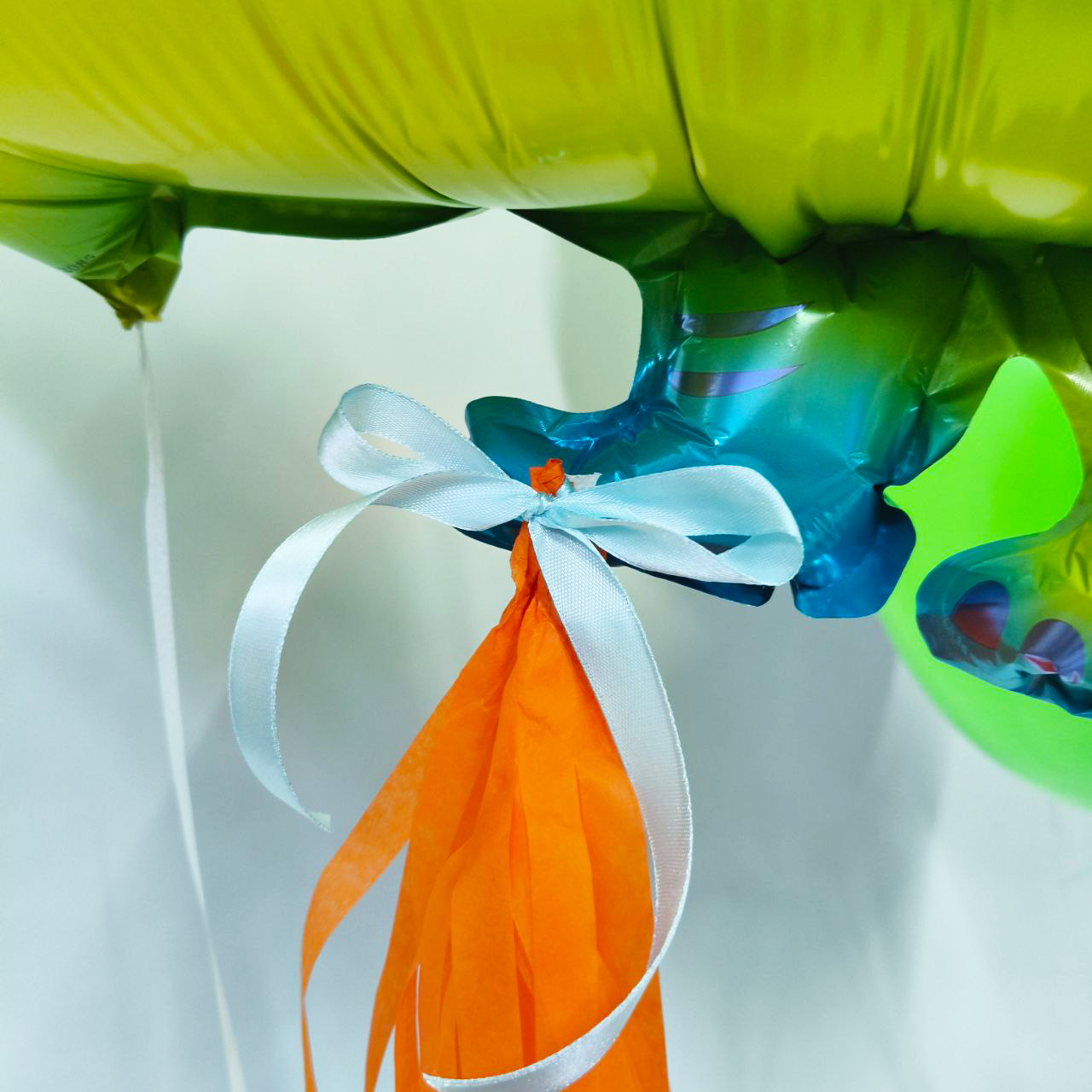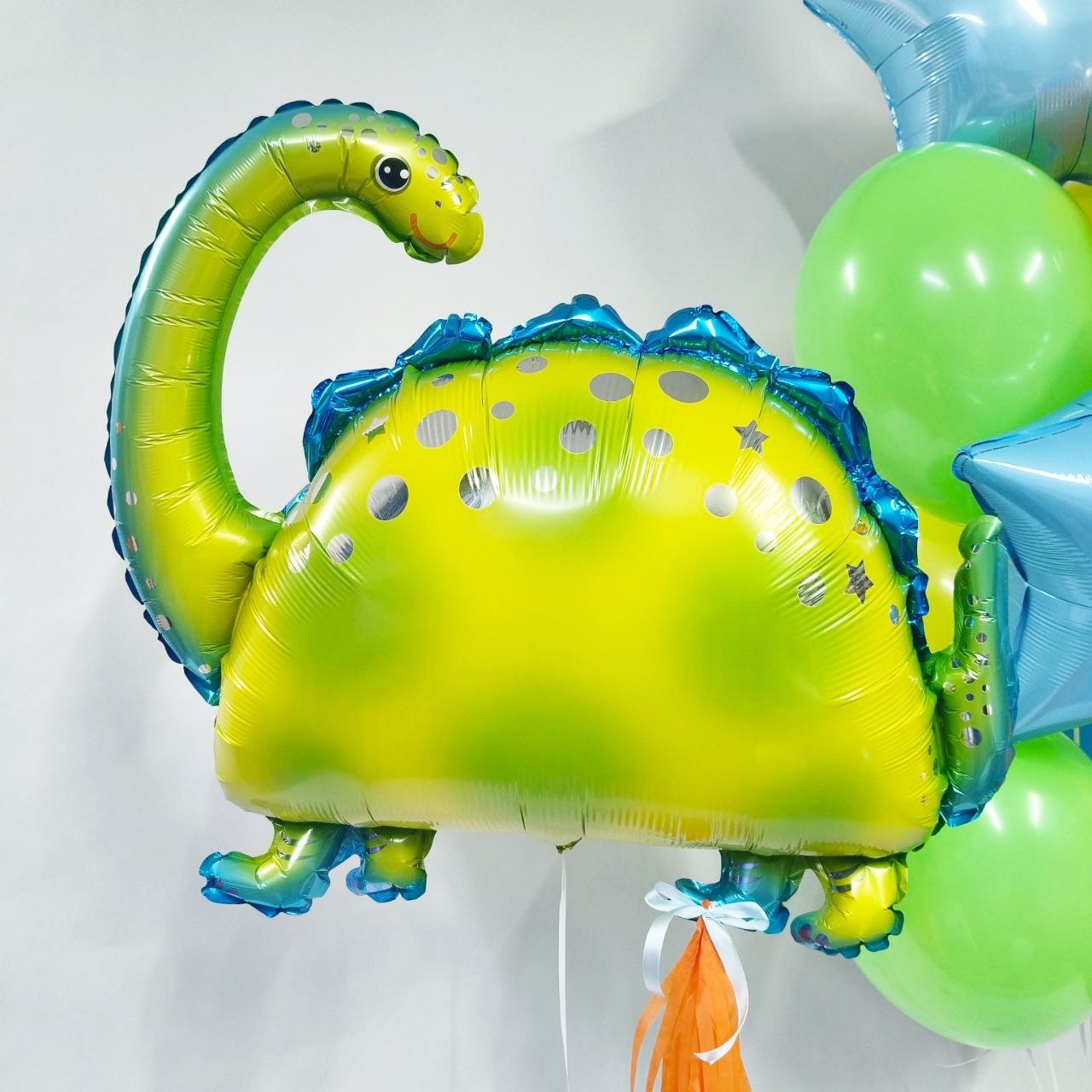 Состав:- динозавр с кисточкой тассел;- 2 желтых, 2 оранжевых, 2 голубых, 2 зеленых шара и именная звездочка...