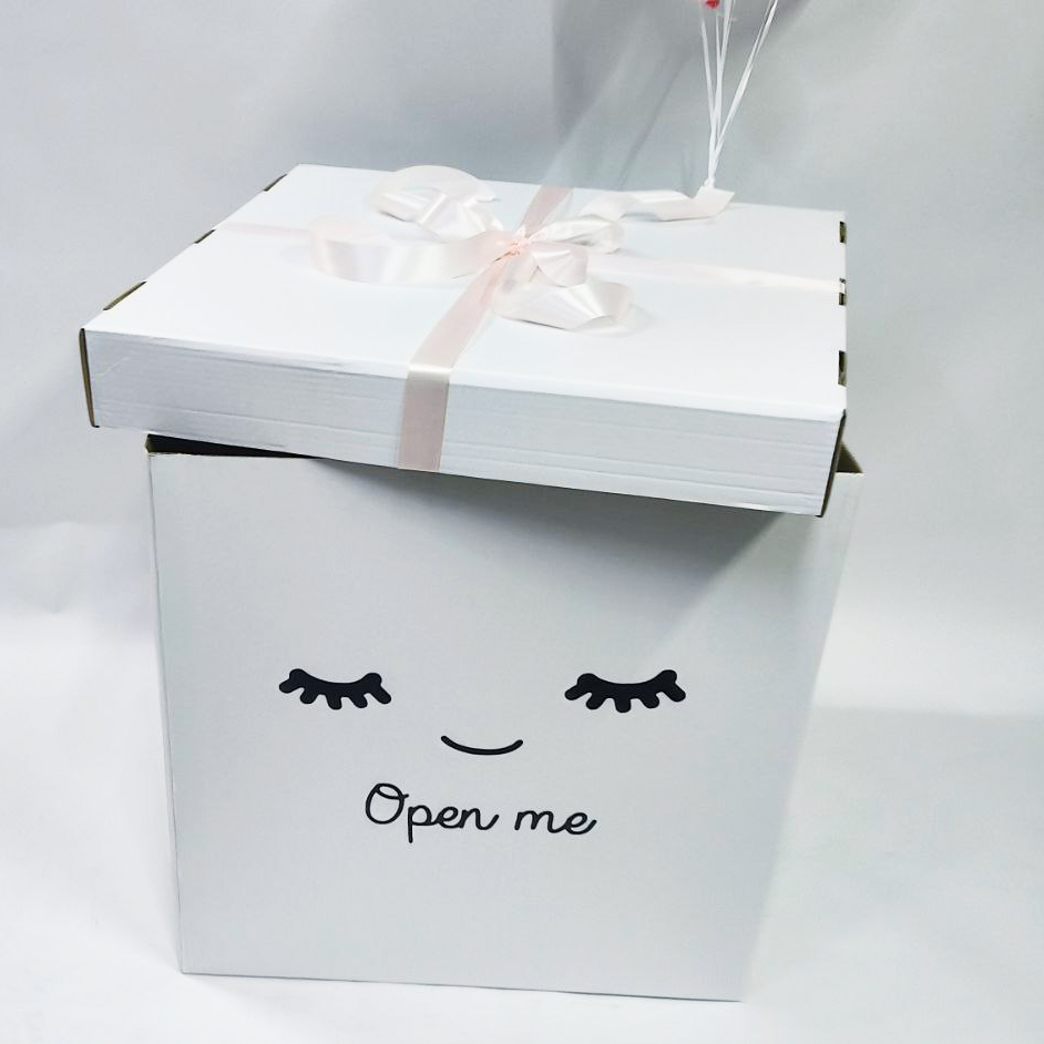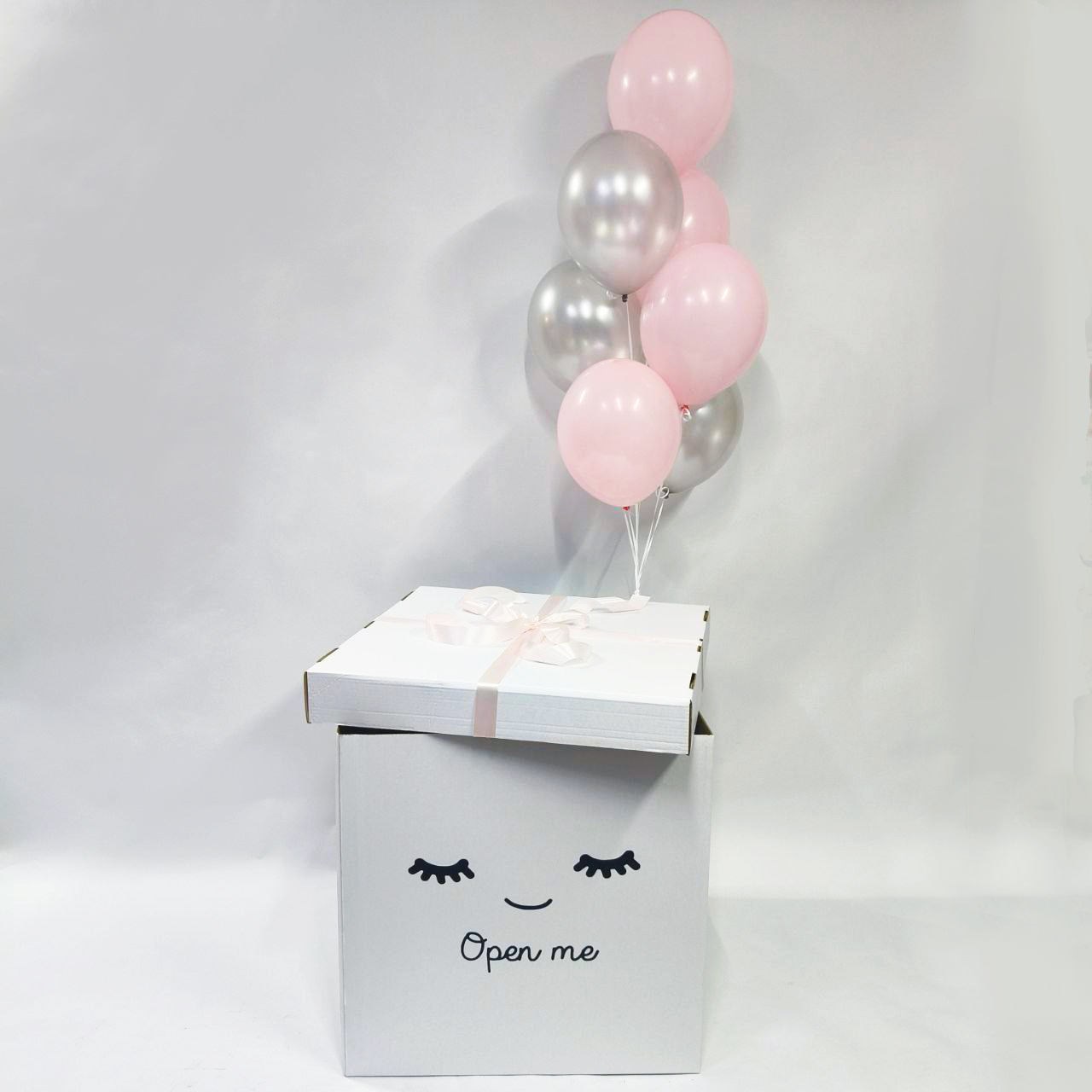 Состав: - белая коробка с розовым бантом, размер коробки - 70х70х70 см; - 4 розовых шара 35 см; - 3 серебристых шара 35 см.