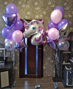 Набор из двух фонтанов с сиреневыми и розовыми шарами, фольгированными звёздами и сердечками, шарами с конфетти + большая фольгированная фигурка единорога.