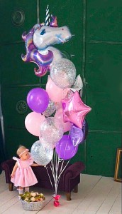 Состав: - сиреневый единорог; - 3 фольгированные звездочки; - 4 шара с конфетти; ..