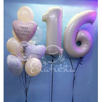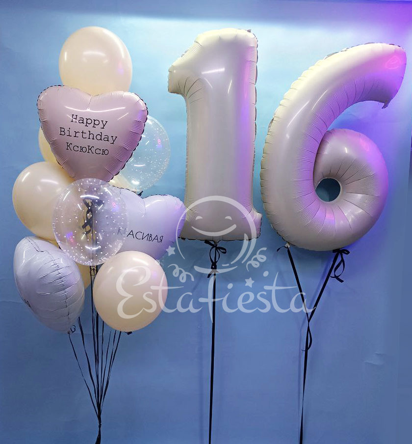 Состав:- 2 цифры (можно выбрать любые);- 2 сердца с комплиментами (красивая, нежная) - можно выбрать другие надписи при желании;- 1 сердце с индивидуальной надписью;- 2 шара с конфетти белые пенопластовые шарики;- 6 кремовых шаров...