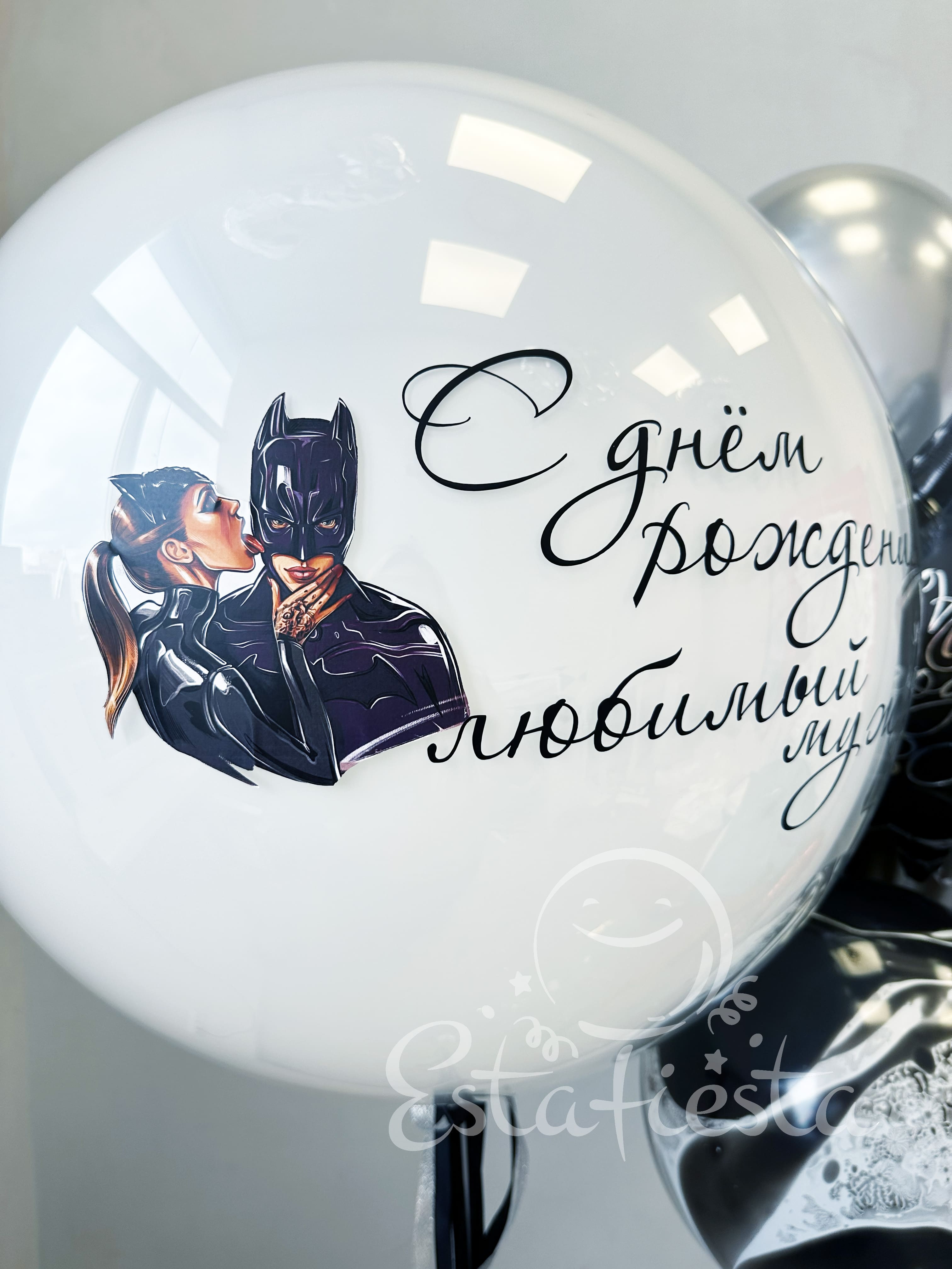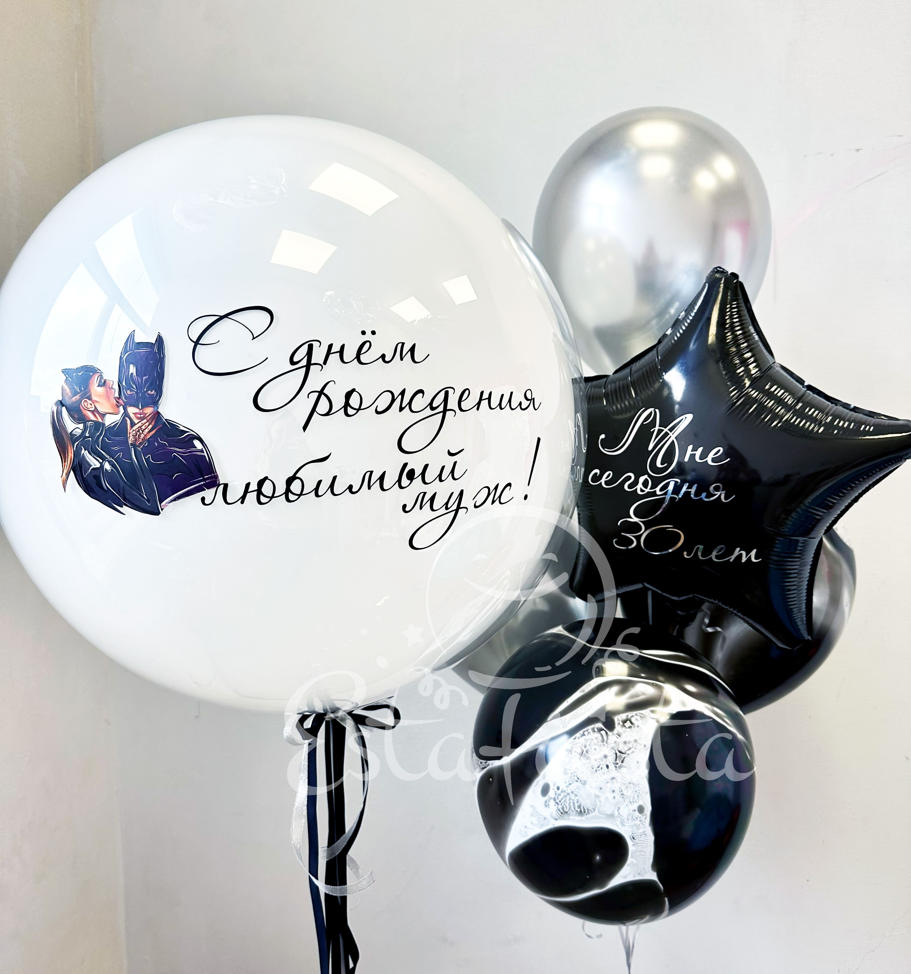 Состав:- черная маска;- большой шар с индивидуальной надписью;- фонтан из 10 черных шаров...