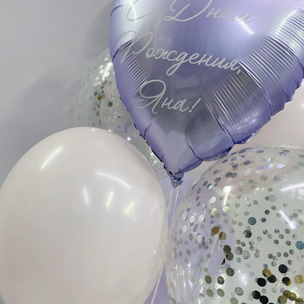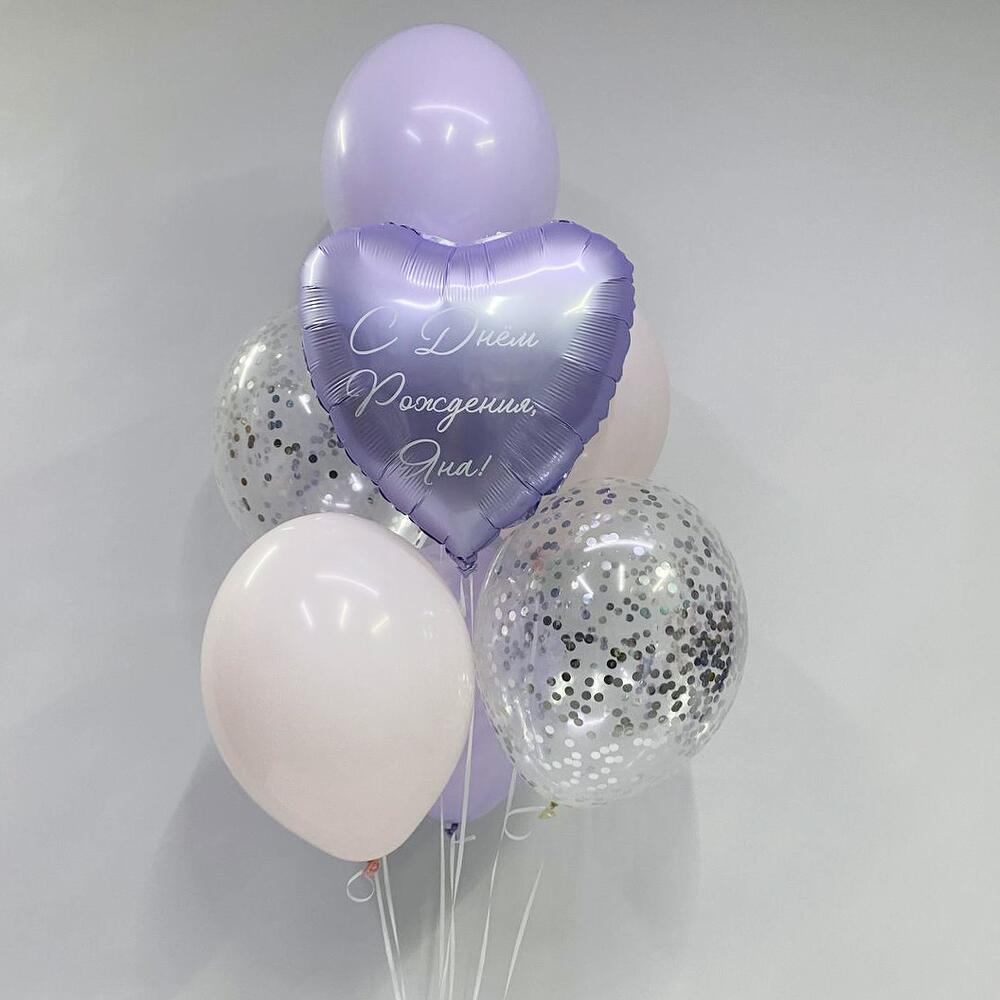 Состав: - сердце 46 см с индивидуальной надписью; - 2 шара 35 см с конфетти; - 2 розовых шара макарунс 35 см; - 2 шара сиреневый макарунс 35 см...