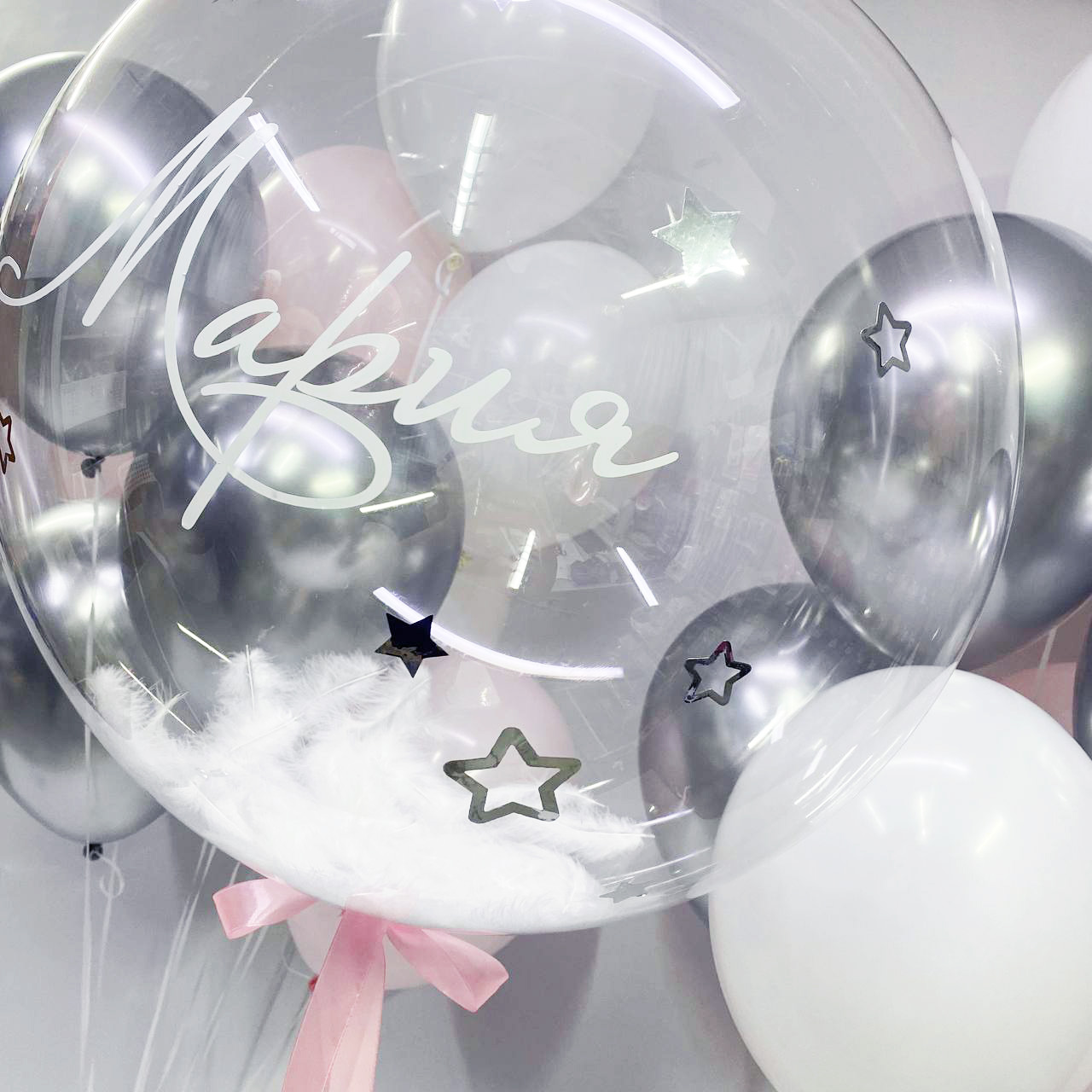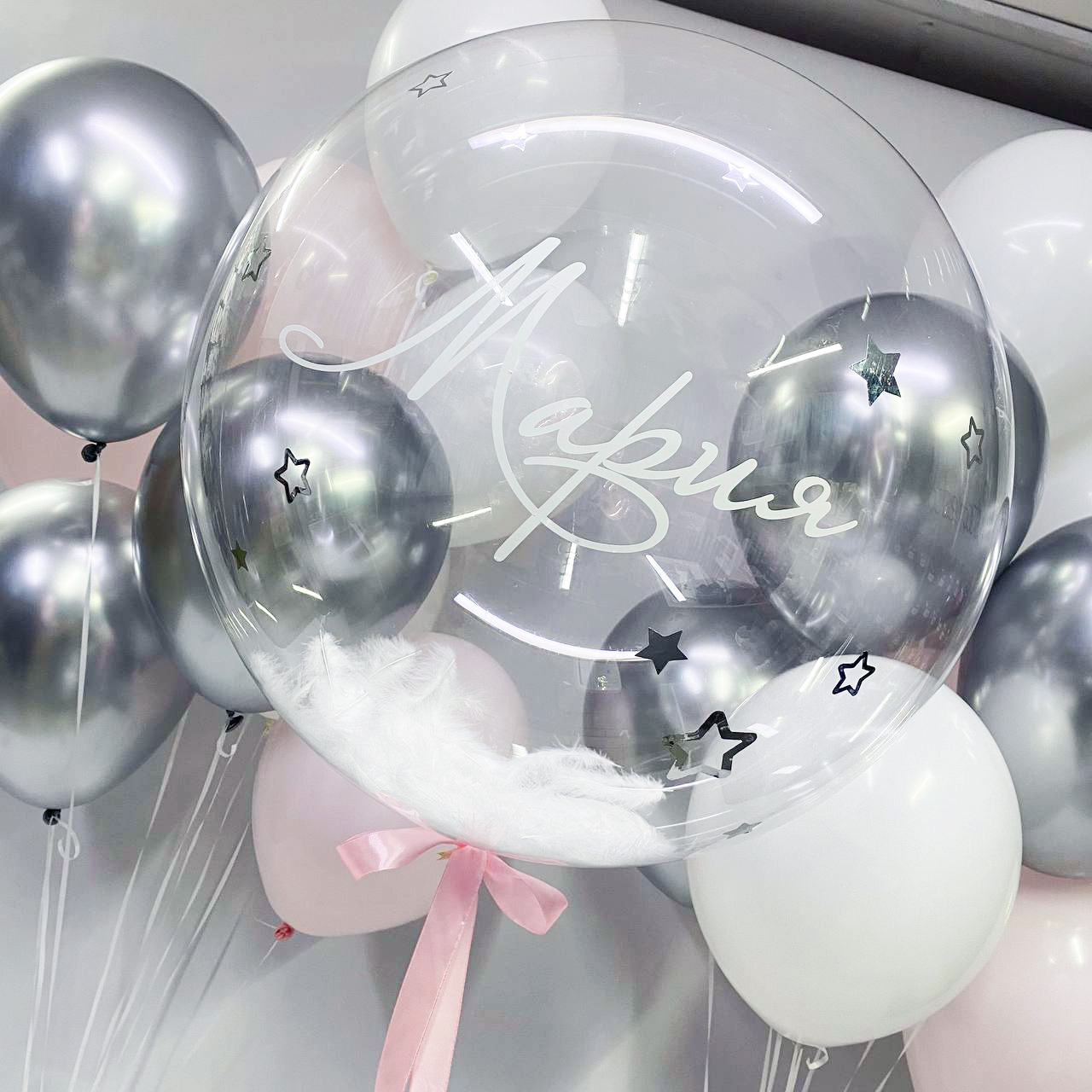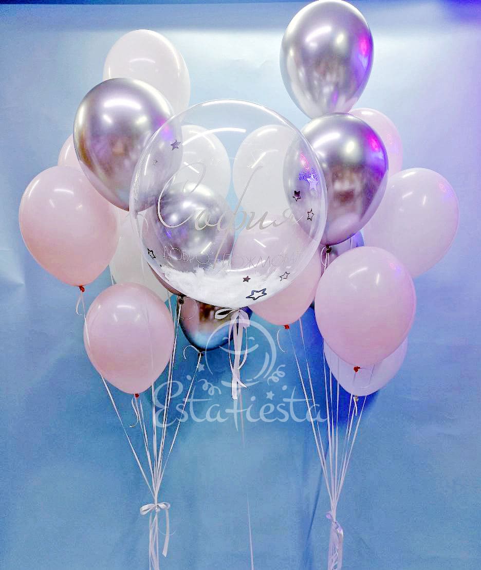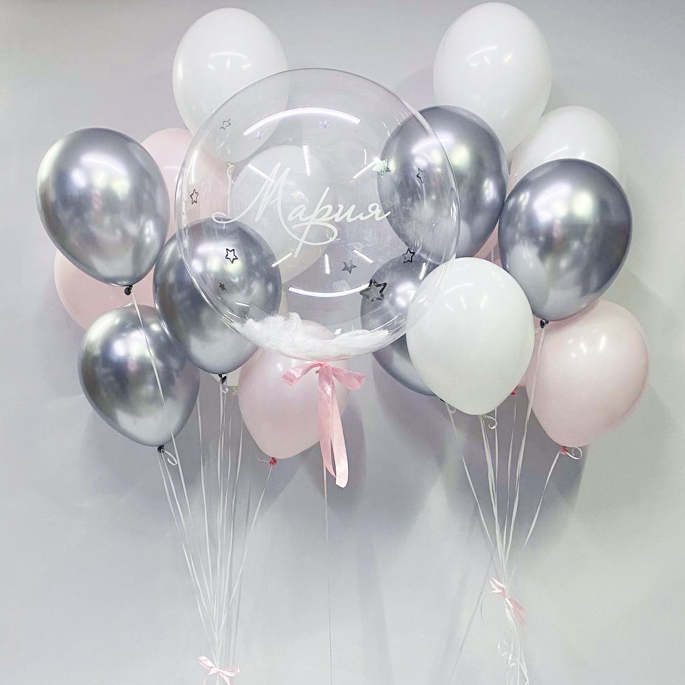 Состав:- баблс с перьями и именем (свое имя пишите в комментариях к заказу);- 2 фонтана по 3 серебряных шара хром, 3 белых шара и 3 шара розовый макарунс...