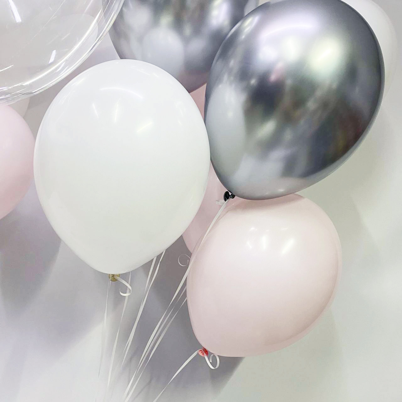 - 2 фонтана по 3 серебряных шара хром, 3 белых шара и 3 шара розовый макарунс.