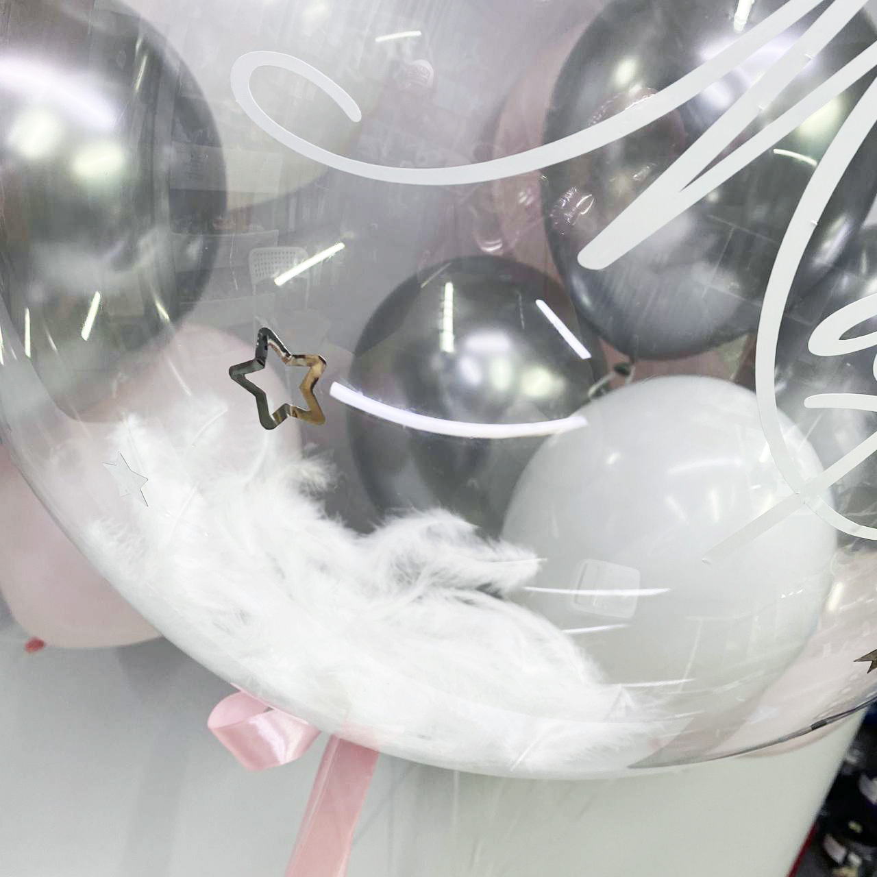 Нежный розово-серебряный сет с именным шаром с перьями