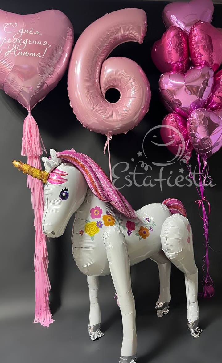 Состав:- большой напольный шар единорог;- цифра (выберите нужную вам в опциях);- большое сердце с индивидуальной надписью на гирлянде тассел;- фонтан из 10 сердец...