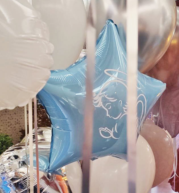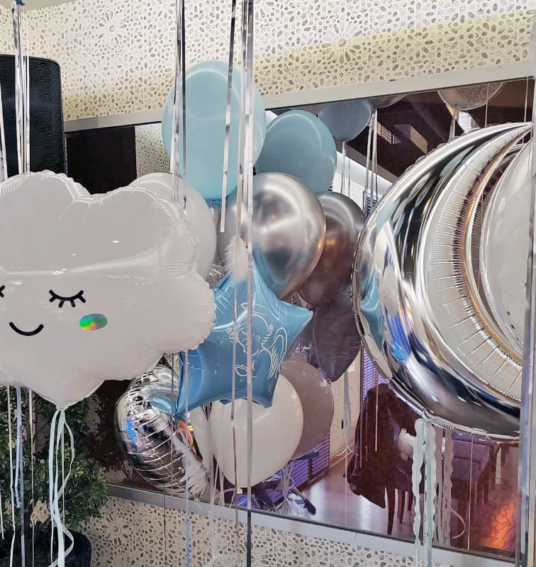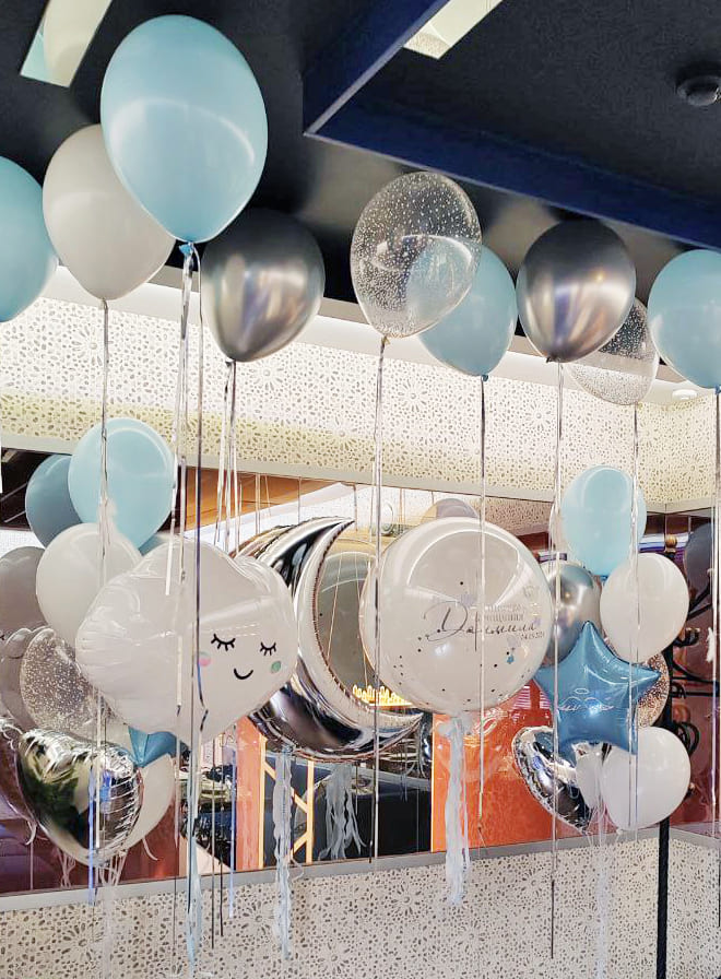 Состав:- большой именной шар "Таинство крещения";- белое облачко;- месяц;- 2 фонтана по: 1 звезде с ангелочками, 1 сердцу, 2 белых шара, 1 серебряному, 1 голубому и 1 с конфетти;- под потолок шары на дождике: 4 голубых, 2 белых, 2 с конфетти, 2 серебряных шара...