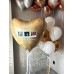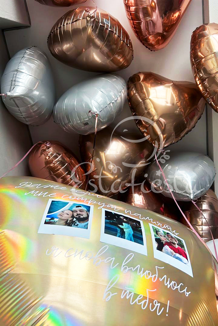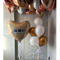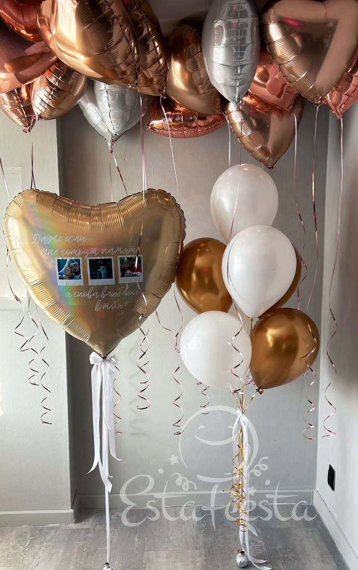 Состав:- большое сердце с индивидуальными фото и надписью;- 15 фольгированных сердец под потолок;- фонтан из 4 белых шаров и 3 золотых шаров...