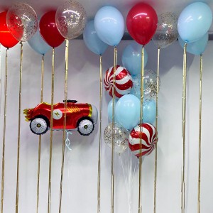 Состав: - ретро-машинка красного цвета; - 2 шара-конфетки красного цвета 45 см; - 2 шара с конфетти 35 см; - 6 голубых шаров 35 см.
