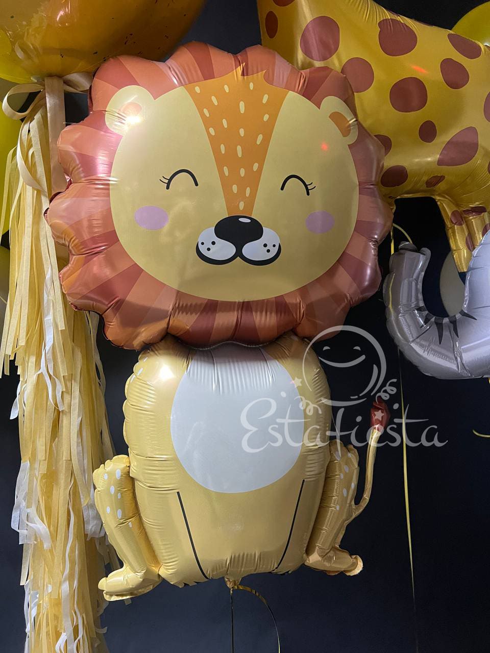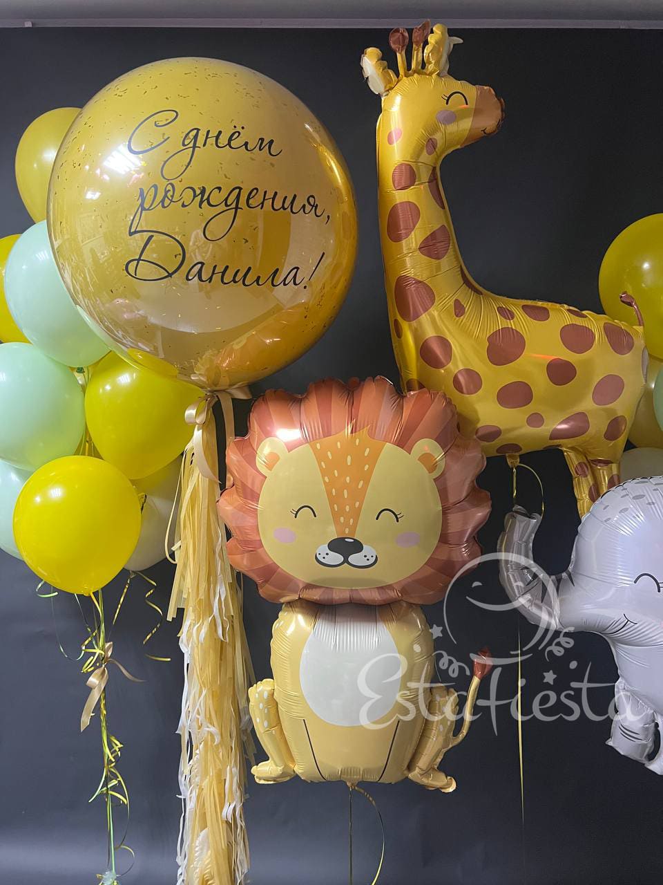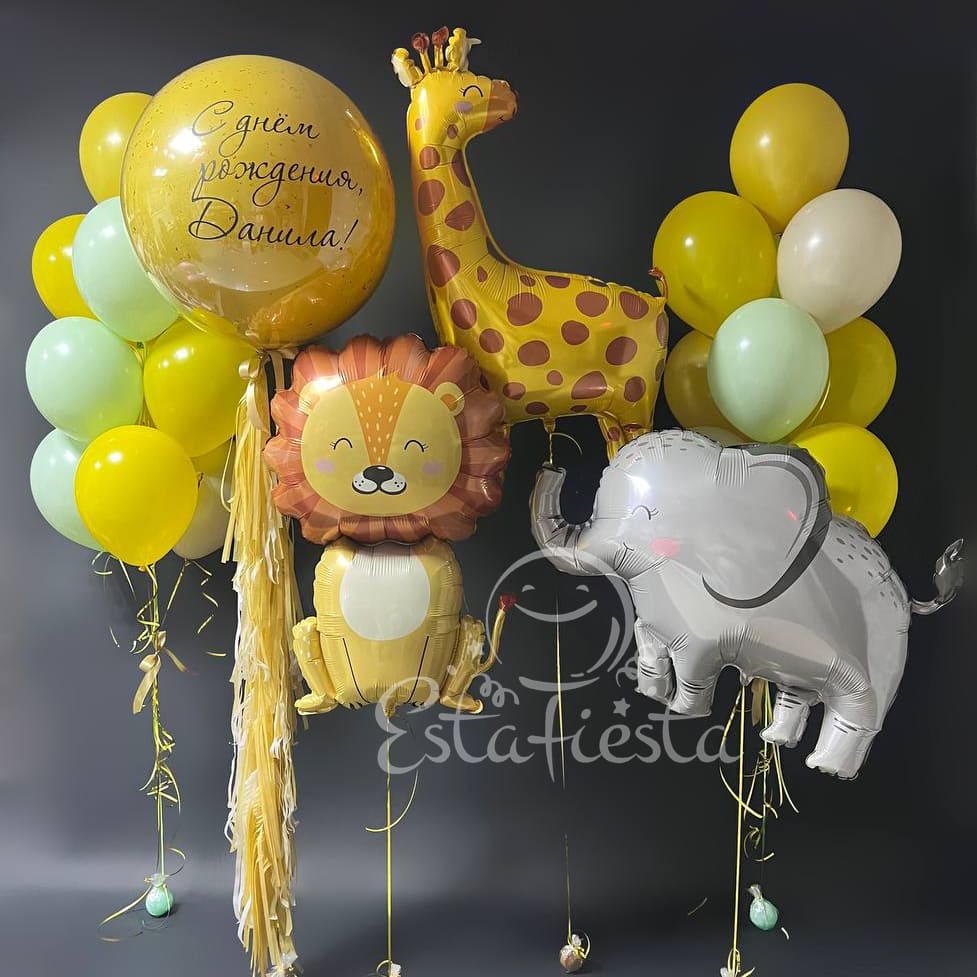 Состав:- большой "стеклянный" шар на гирлянде тассел;- лев;- жираф;- слон;- 2 фонтана по 10 шаров...