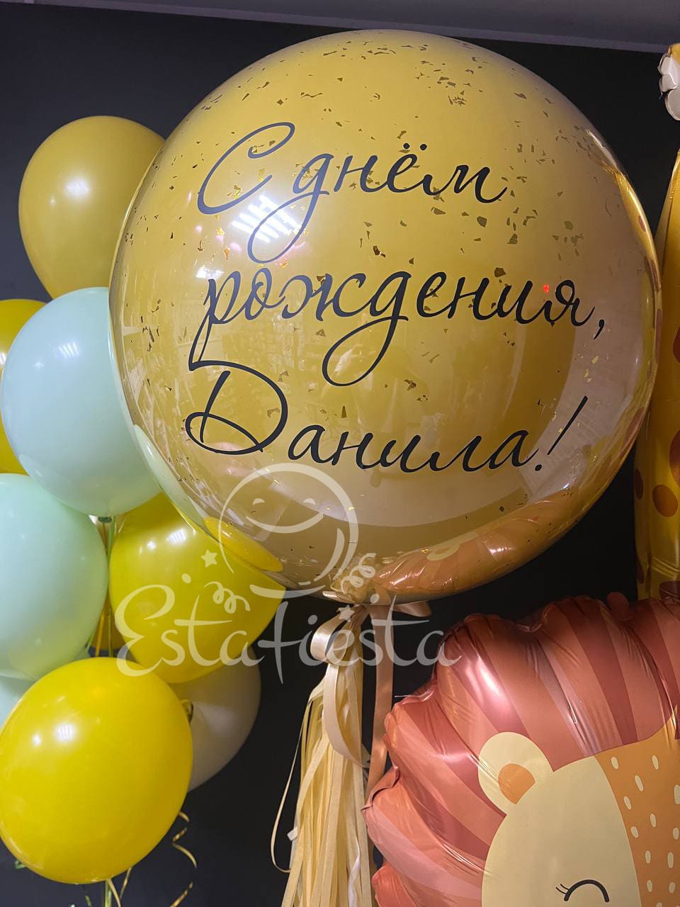 Композиция из шаров с фольгированным леопардом включает 5 гелиевых воздушных шаров, под..