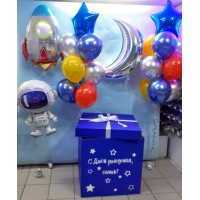 Состав:- коробка с индивидуальной надписью и звездами;- космонавт;- ракета;- месяц;- 2 фонтана по 1 звезде и 9 латексных шаров...