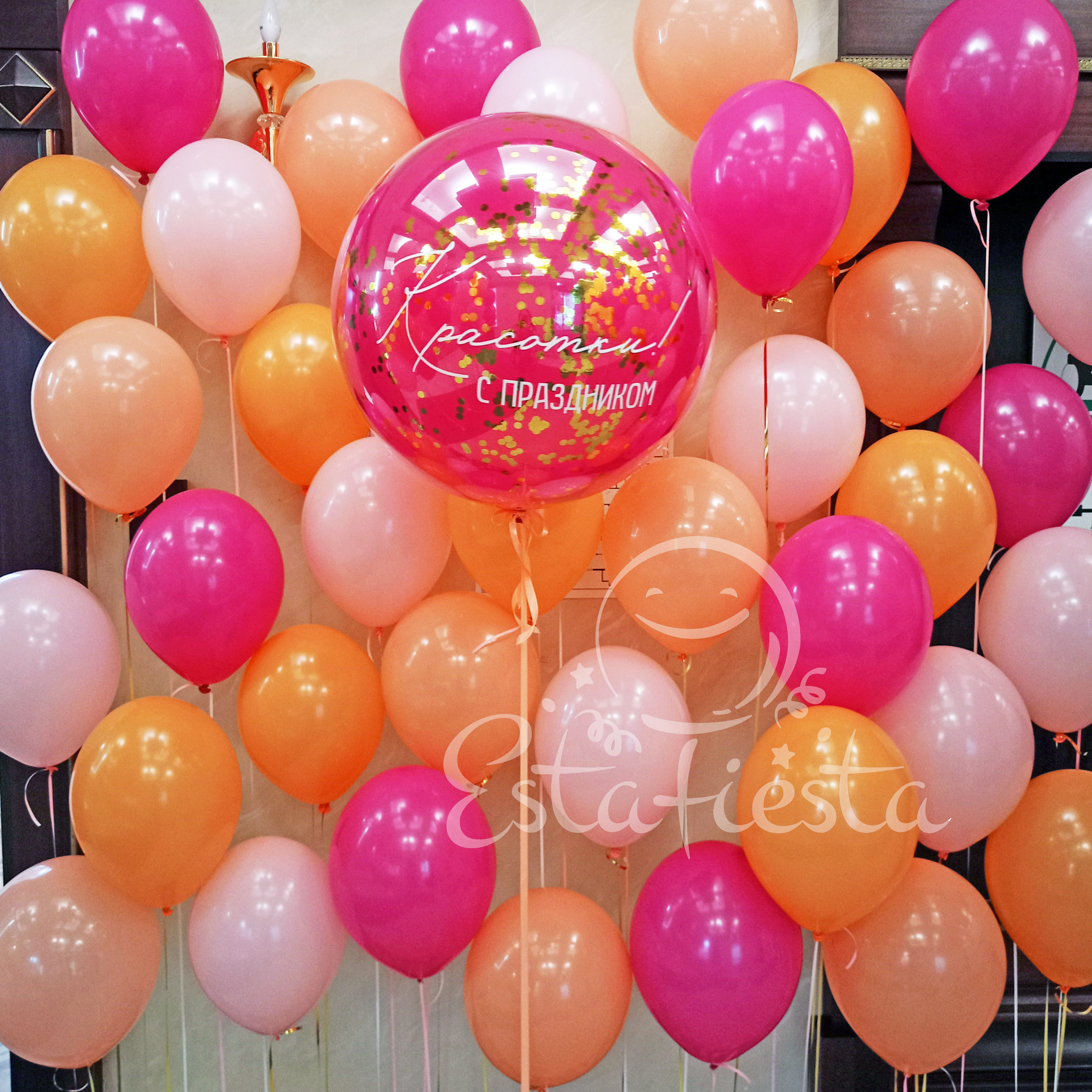 Розово-оранжевое яркое оформление шарами "С праздником, красотки!"