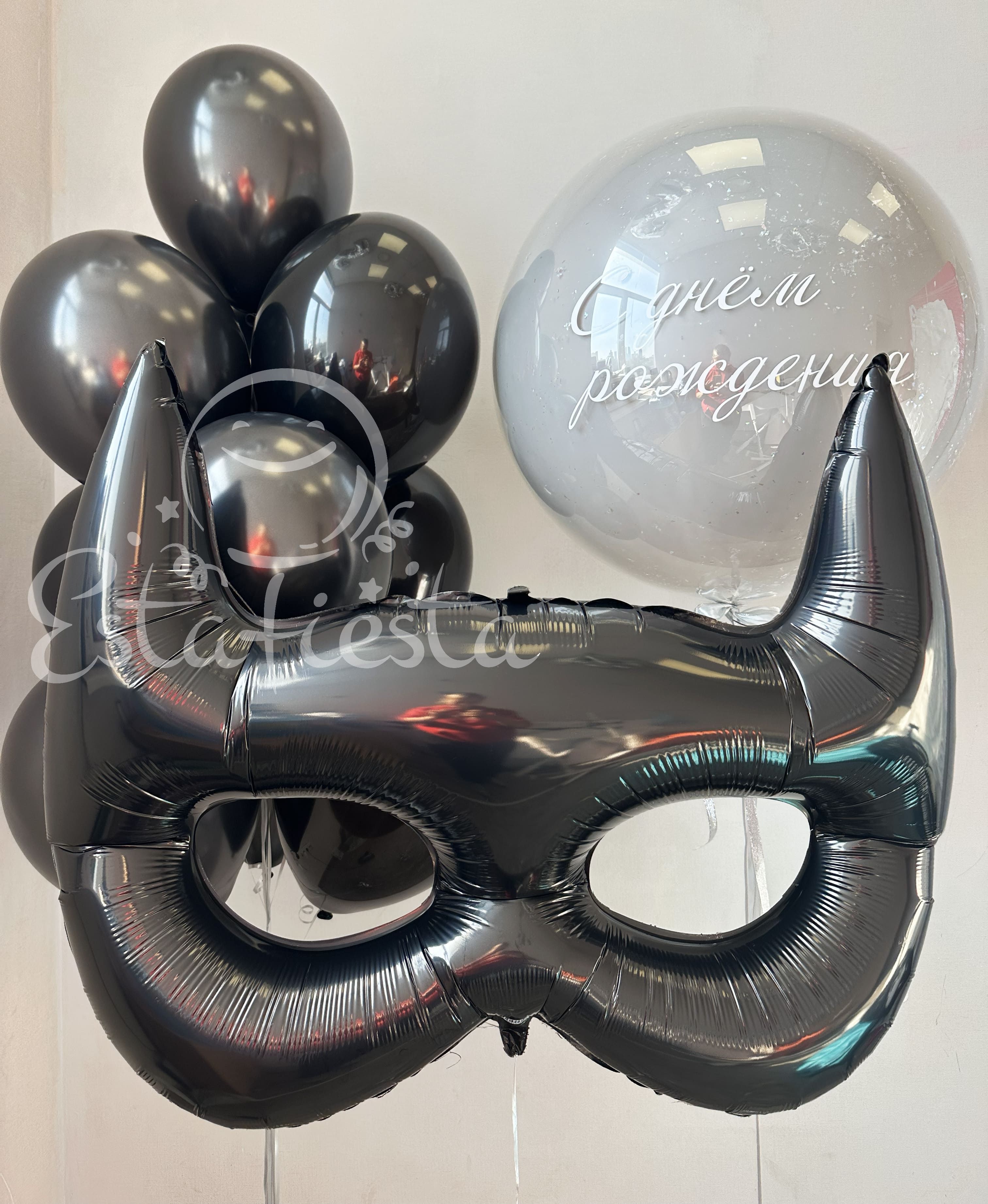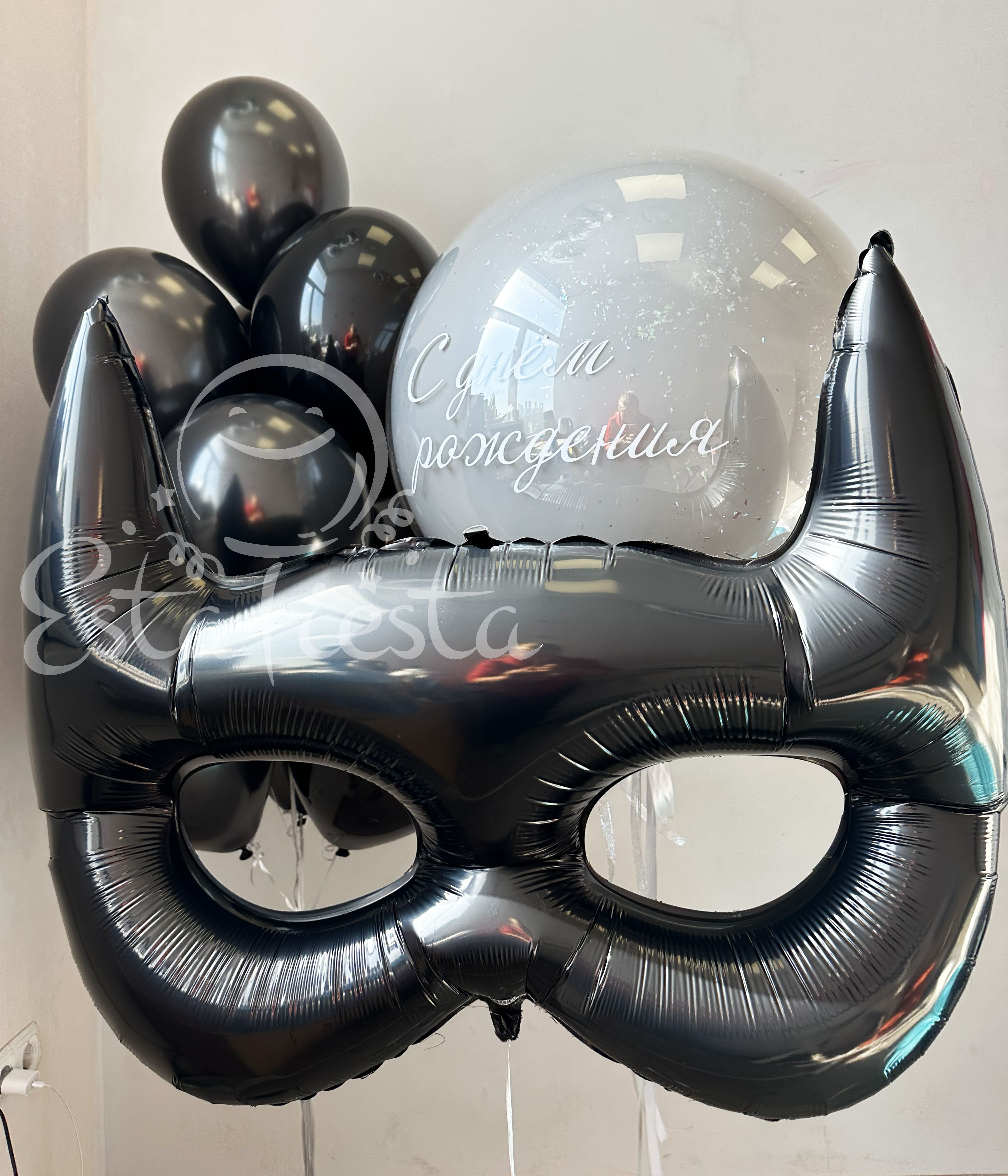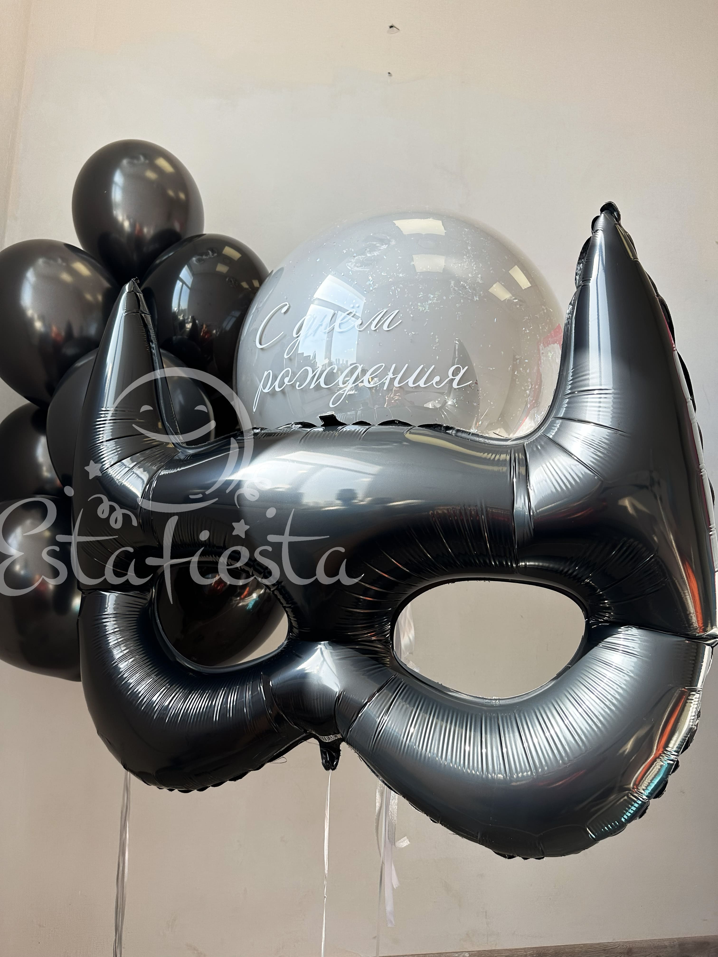 Состав:- черная маска;- большой шар с индивидуальной надписью;- фонтан из 10 черных шаров...