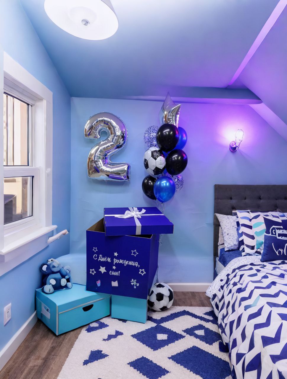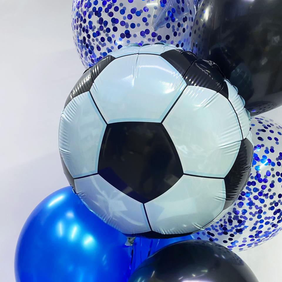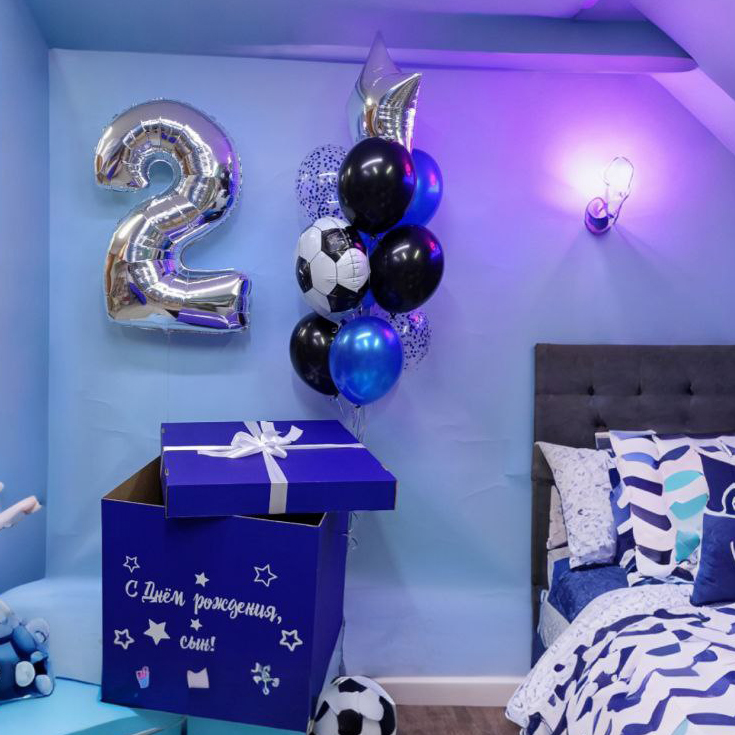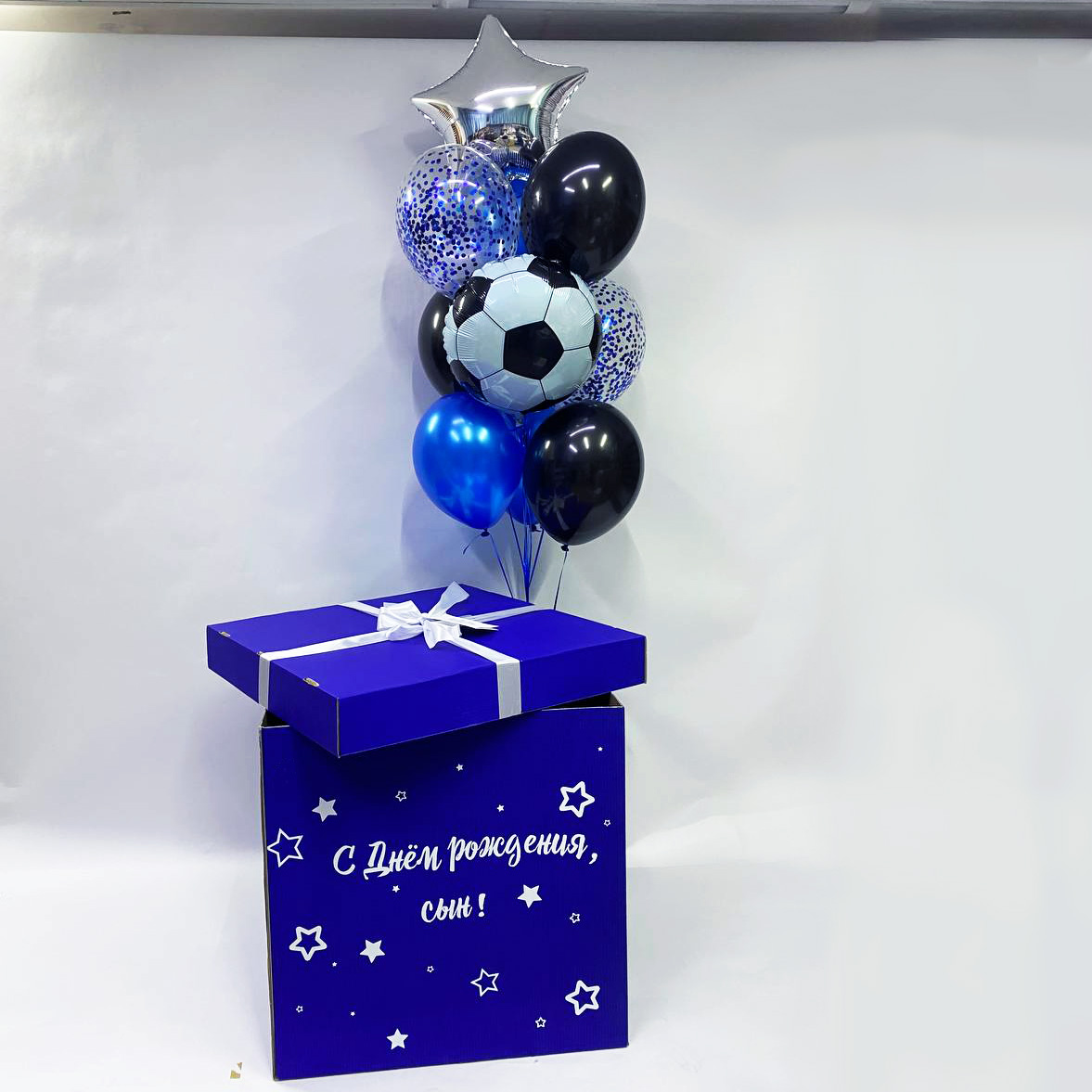 Состав: - 1 синяя коробка с надписью и бантом; - 1 серебряная фольгированная звезда; - 1 фигурный фольгированный шар футбольный мяч; - 2 шара с синим конфетти; - 3 синих шара металлик; - 3 черных стандартных шара...
