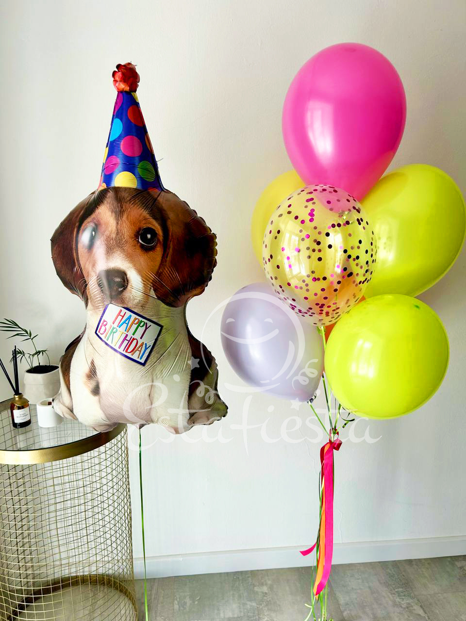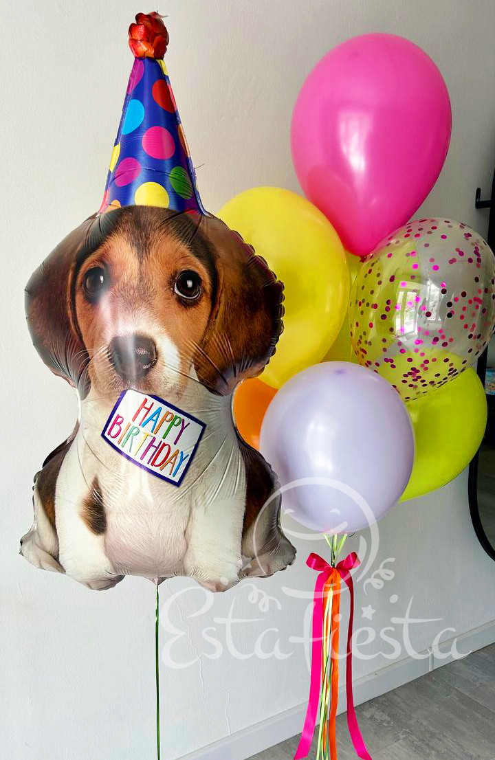 Состав:- щенок в колпаке;- фонтан из 1 шара с конфетти, 2 шаров apple green, 1 шара сиреневый макарунс, 1 желтого, 1 оранжевого шара и 1 фуксии...