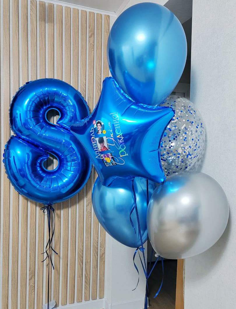 Состав:- синяя цифра (выберите нужную в опциях);- звезда с вашими фото;- 2 синих шара;- 1 серебряный шар;- 1 шар с конфетти...