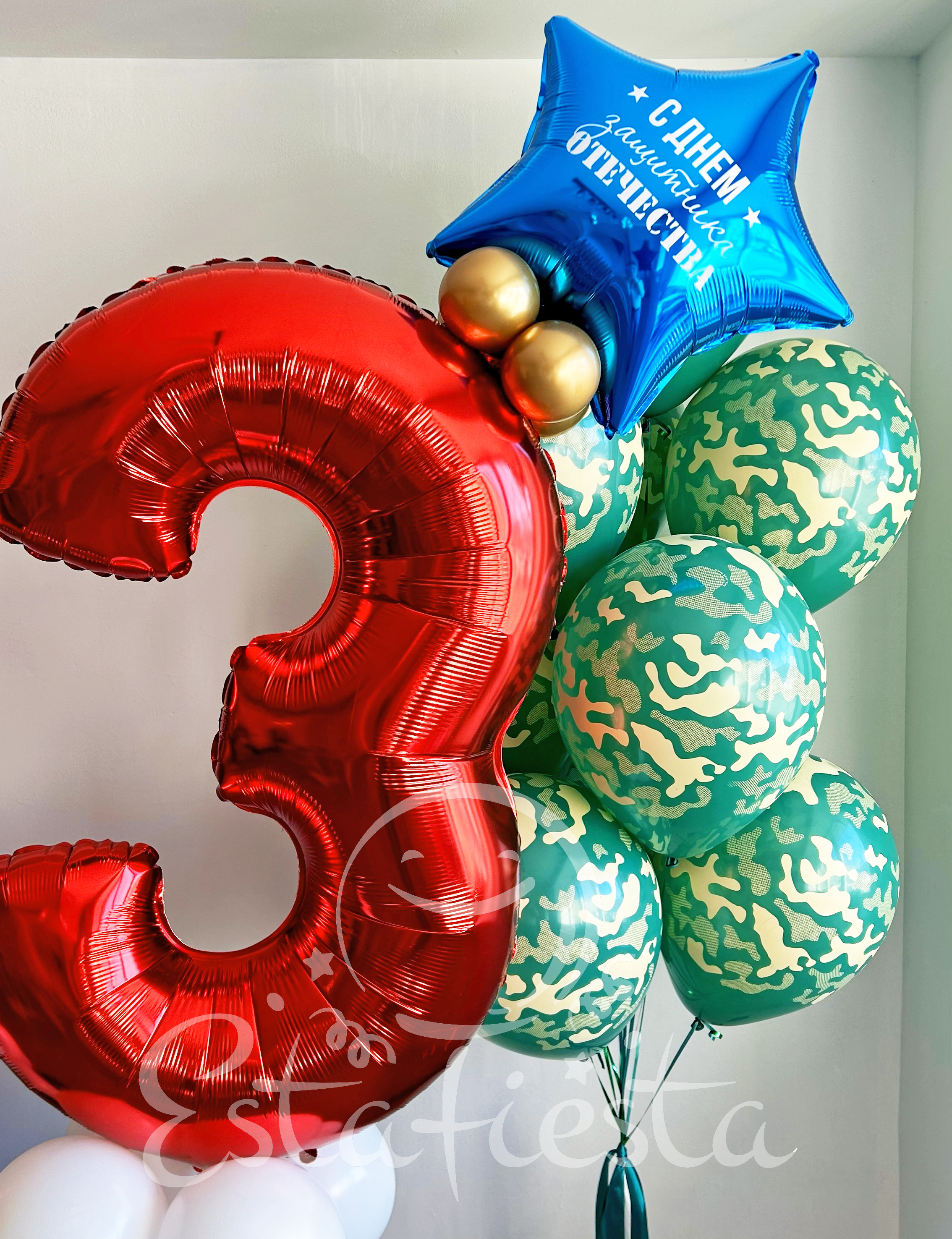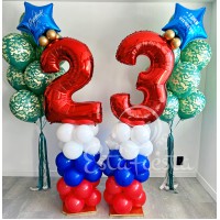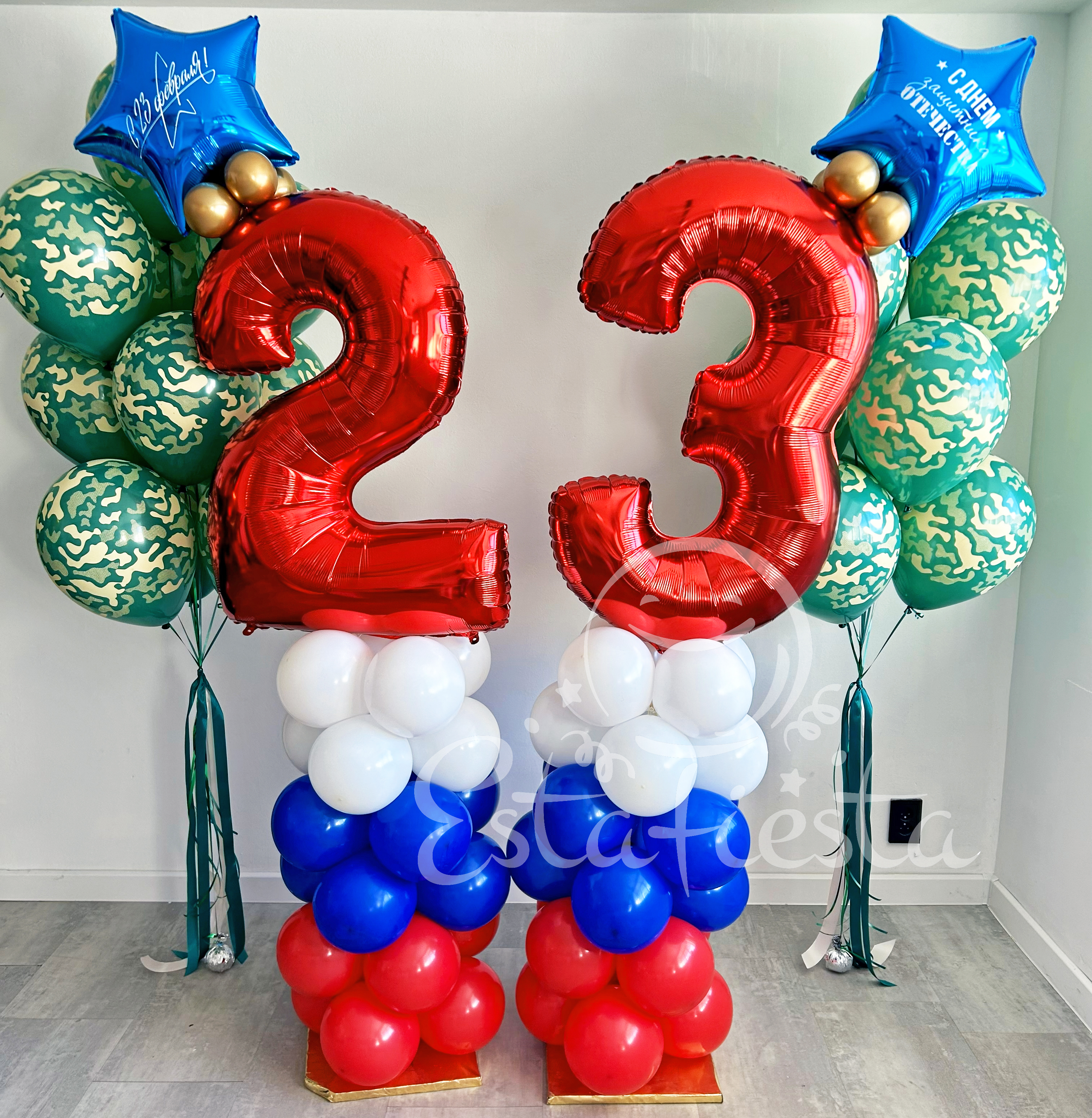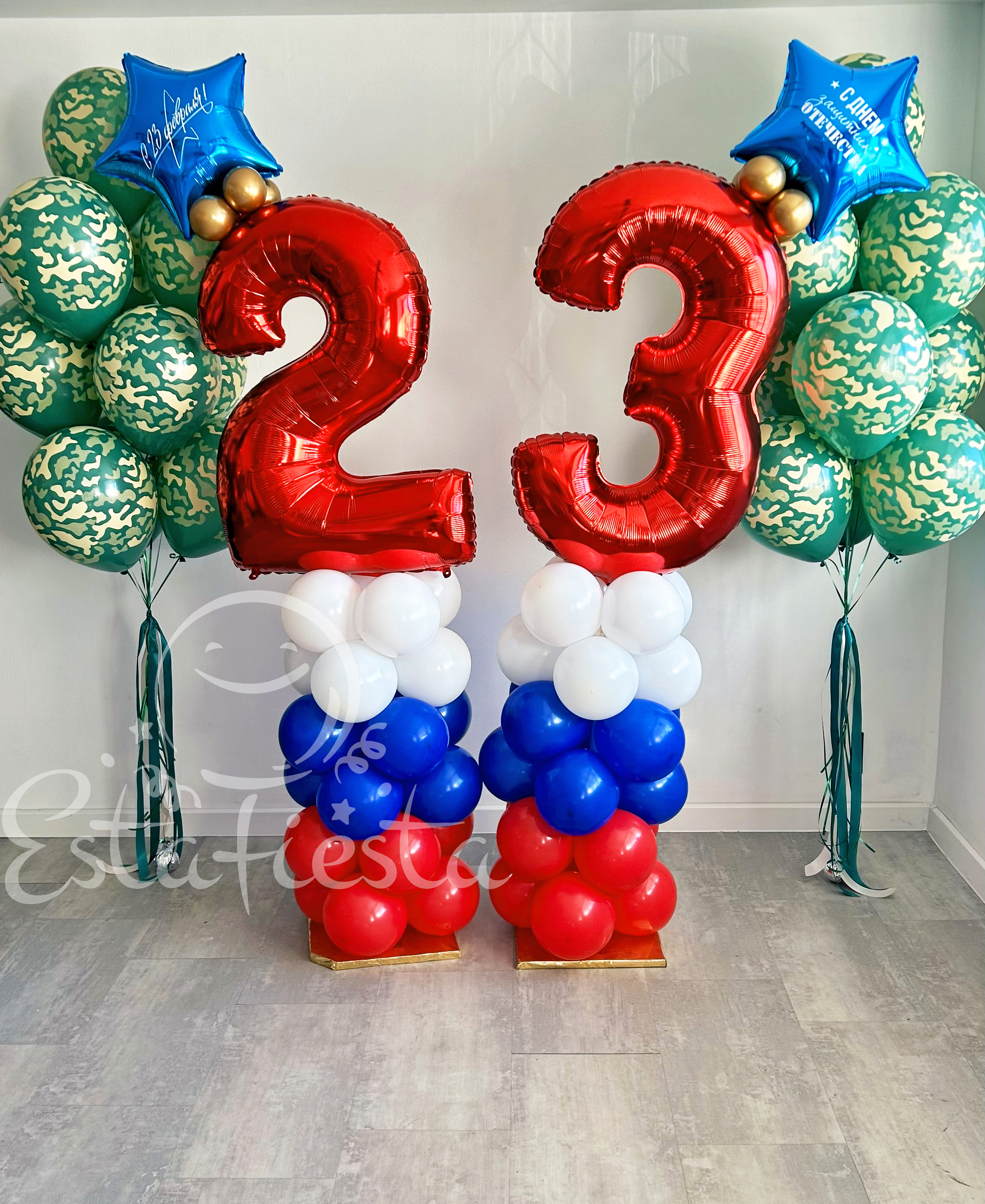 Состав:- 2 фонтана по 10 камуфляжных шаров.- 2 стойки триколор из шаров с красными цифрами и звездами.Надписи на звездах: С 23 февраля и С Днем защитника Отечества...