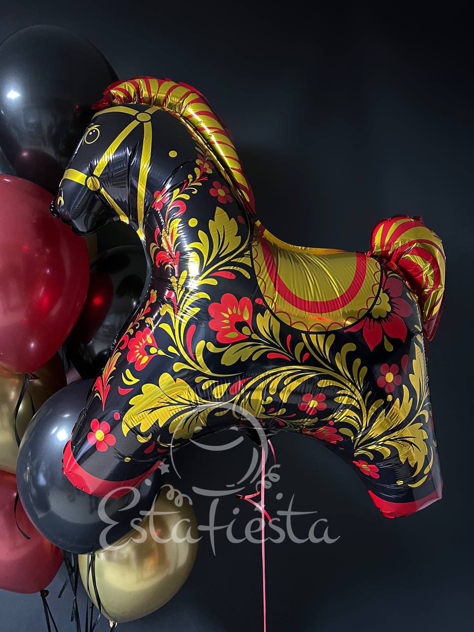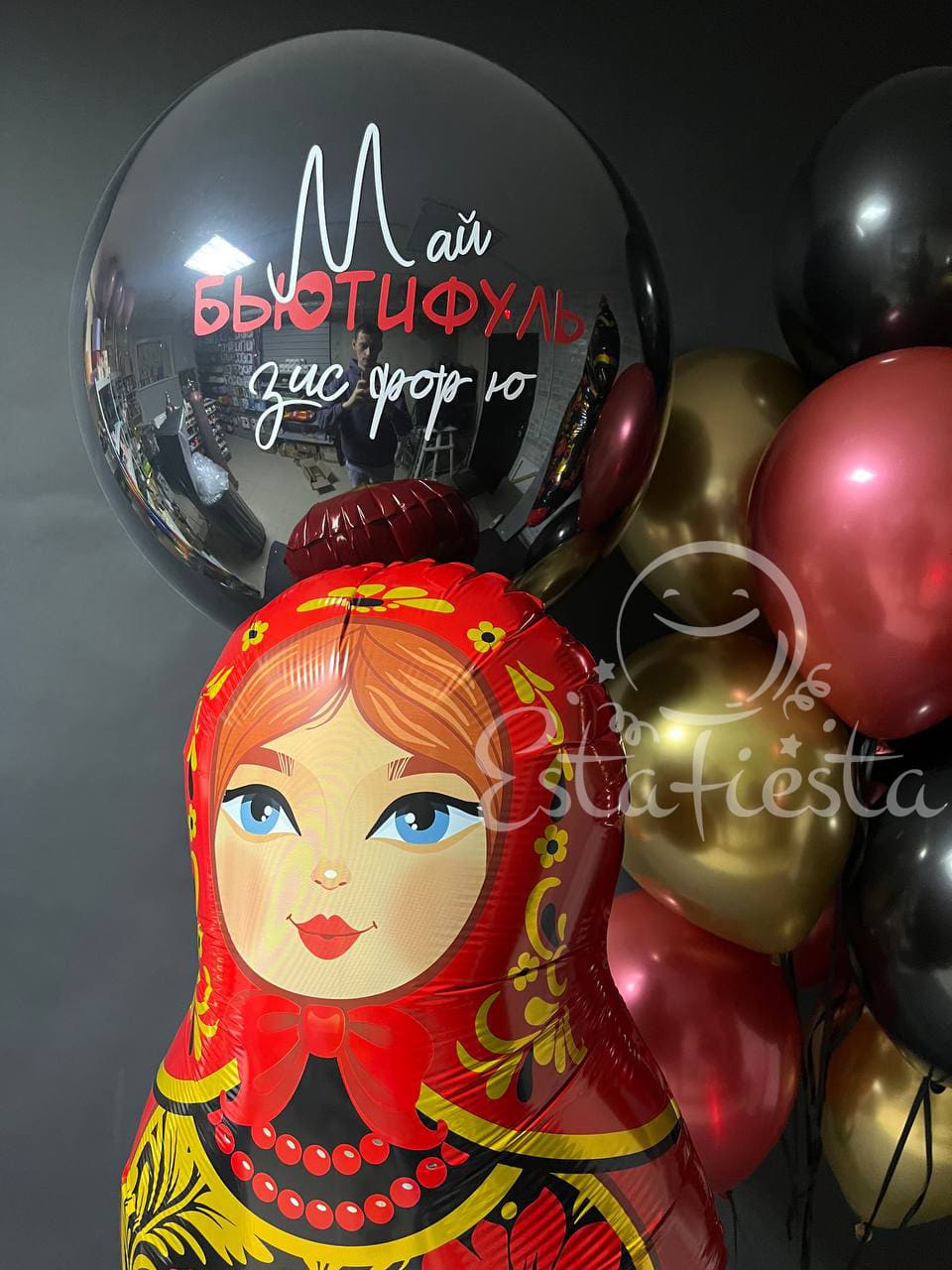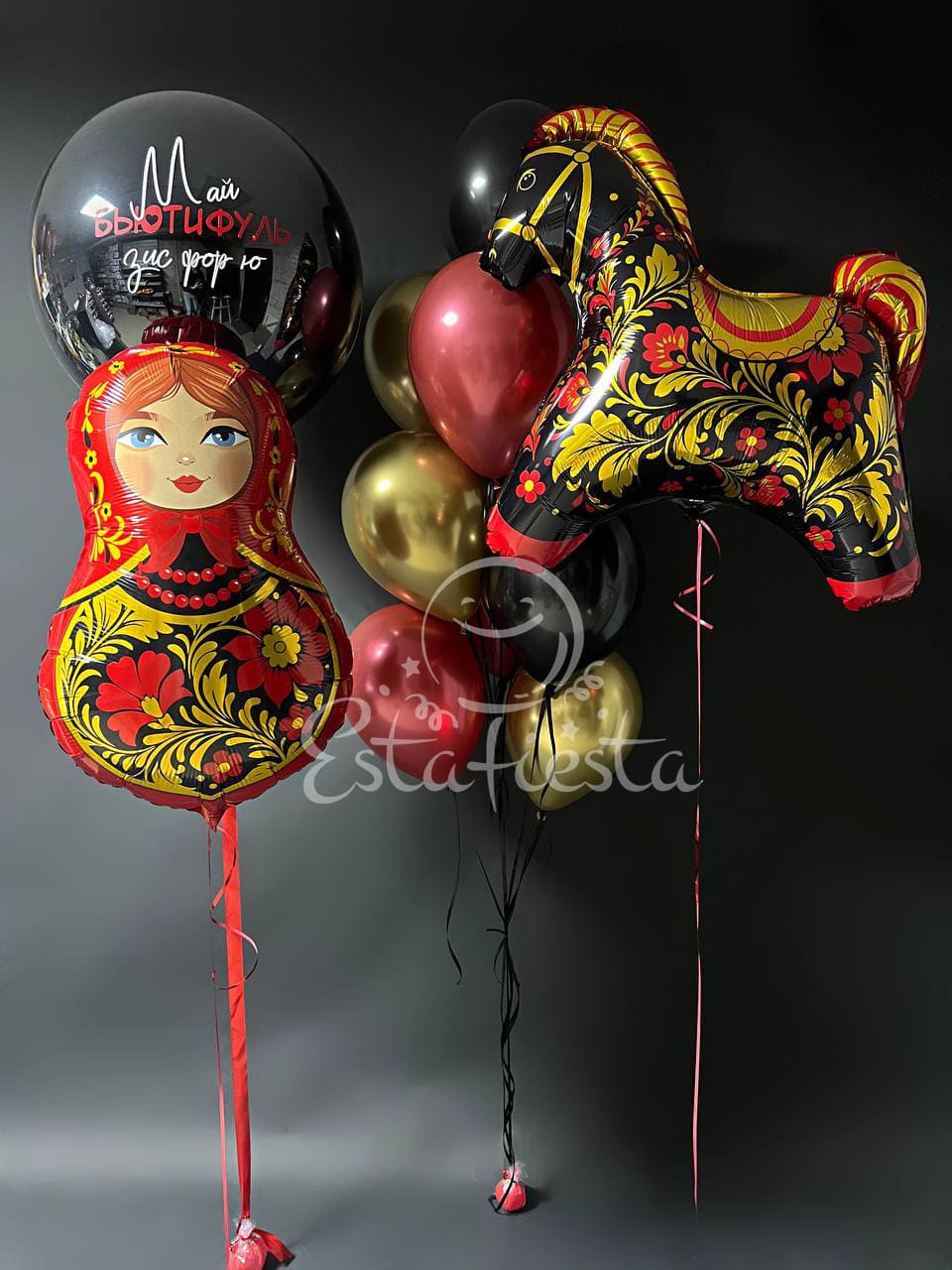 Состав:- большой шар с надписью "Май бьютифуль зис фор ю" (можно заменить на свою надпись);- матрешка с русской росписью в стиле хохлома;- лошадка с русской росписью в стиле хохлома;- фонтан из 4 черных, 3 красных и 3 золотых шаров...