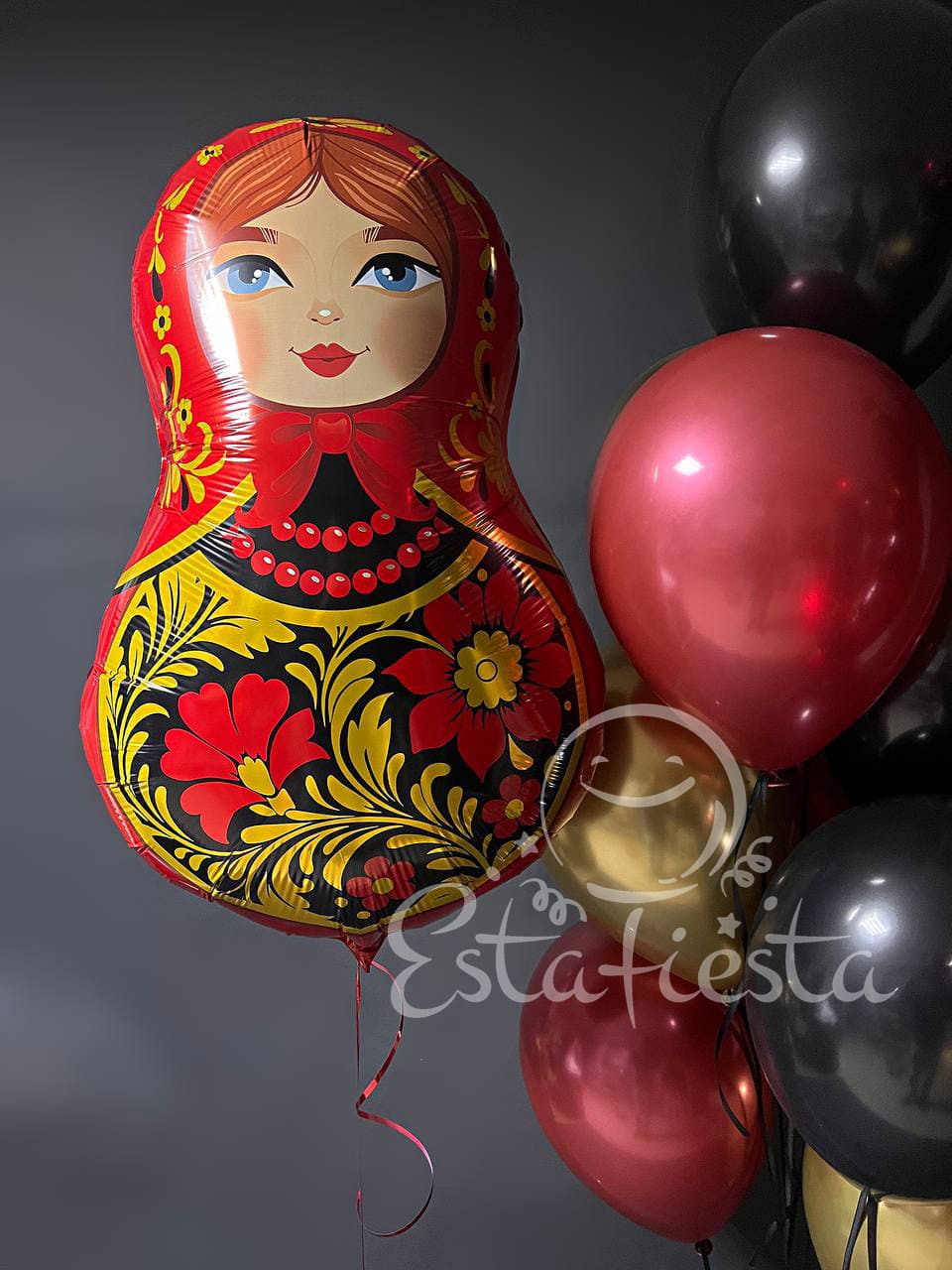 Трендовая композиция из шаров с матрешкой с росписью хохлома