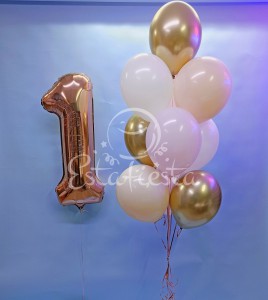 Состав:- Фольгированная цифра розовое золото- Фонтан из латексных шаров: 3 золотой хром, 2 бежевых, ..